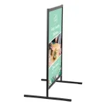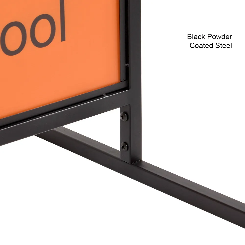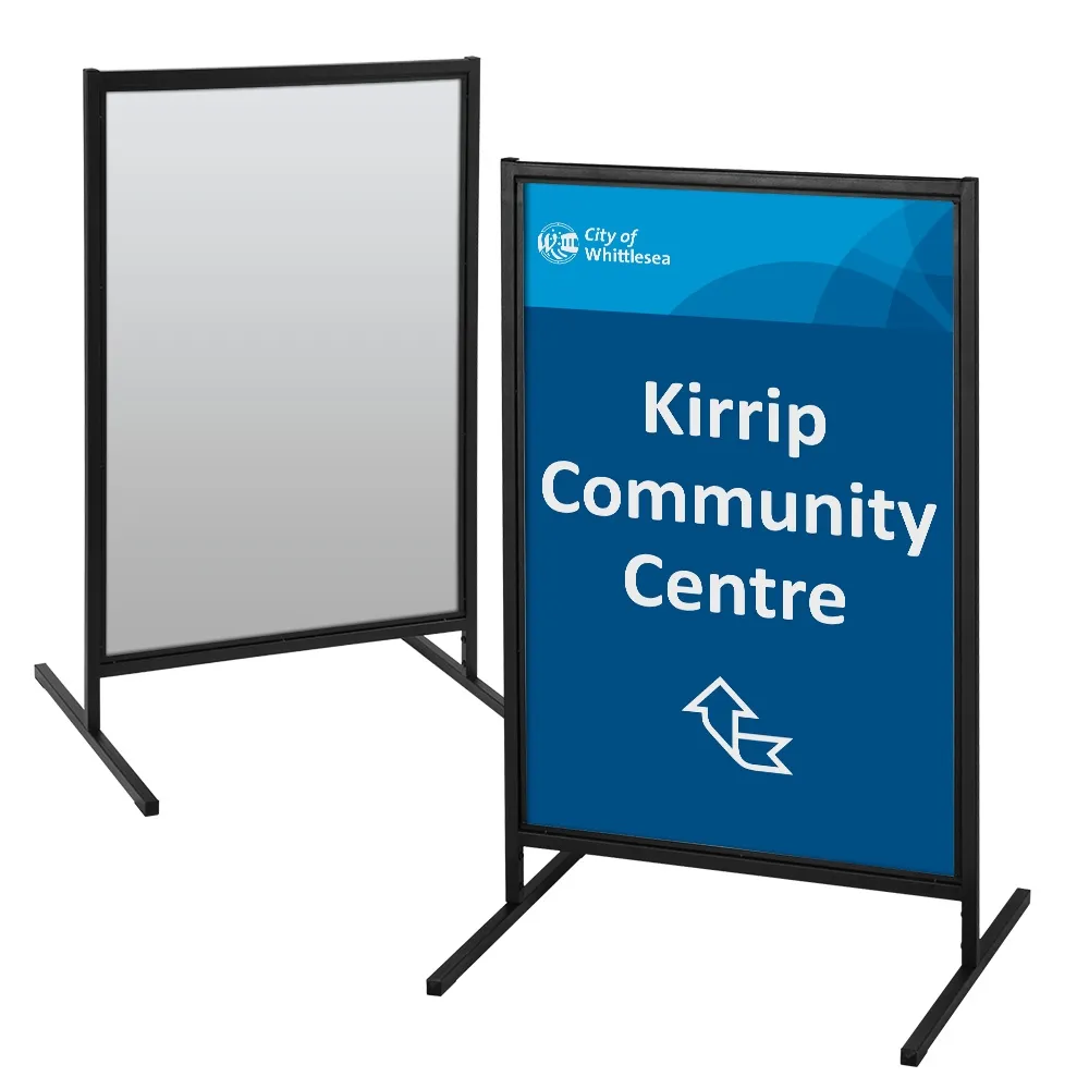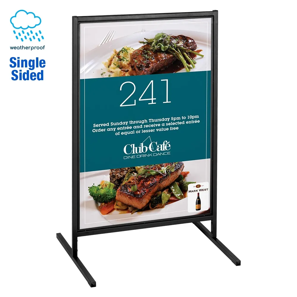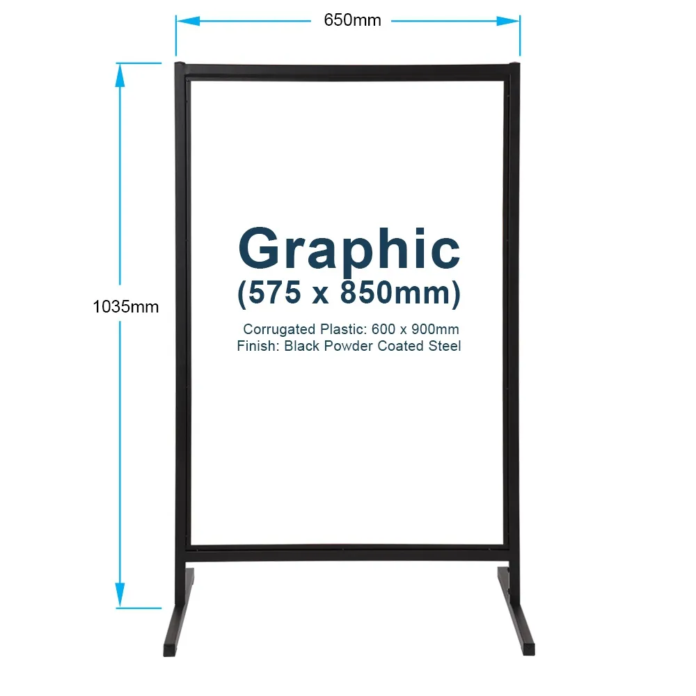 This single sided indoor or outdoor floor sign features a steel frame with a powder-coated black finish and includes your artwork printed in full colour using a weather proof ink on a 5mm corrugated board. The result is an economical yet durable sign that is well suited to the heavy use that can occur in public spaces such as shopping centres, footpaths and car parks.