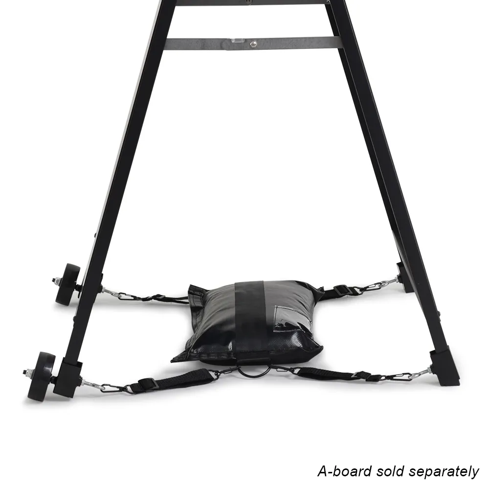 The A frame sign kit, part of our line of pavement signs, has a set of (4) adjustable weaved nylon straps to connect the four legs of a promotional sign to the provided weighted bag using quick clips. These straps adjust between 130mm and 210mm to work with a wide variety of sandwich board sizes. The included sandbag weighs 10kg and is made from durable black vinyl for long lasting use. A nylon strap makes it easy to carry the bag into your desired position, with D-hooks on each securing the bag to the straps and legs, no tools needed! Order today by 3pm AEST to receive same day Australia-wide shipping with this and most other in stock products, only from Slimline Warehouse!