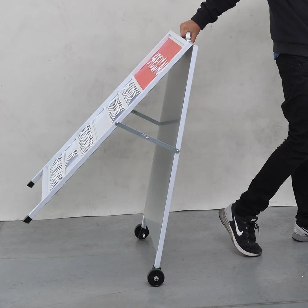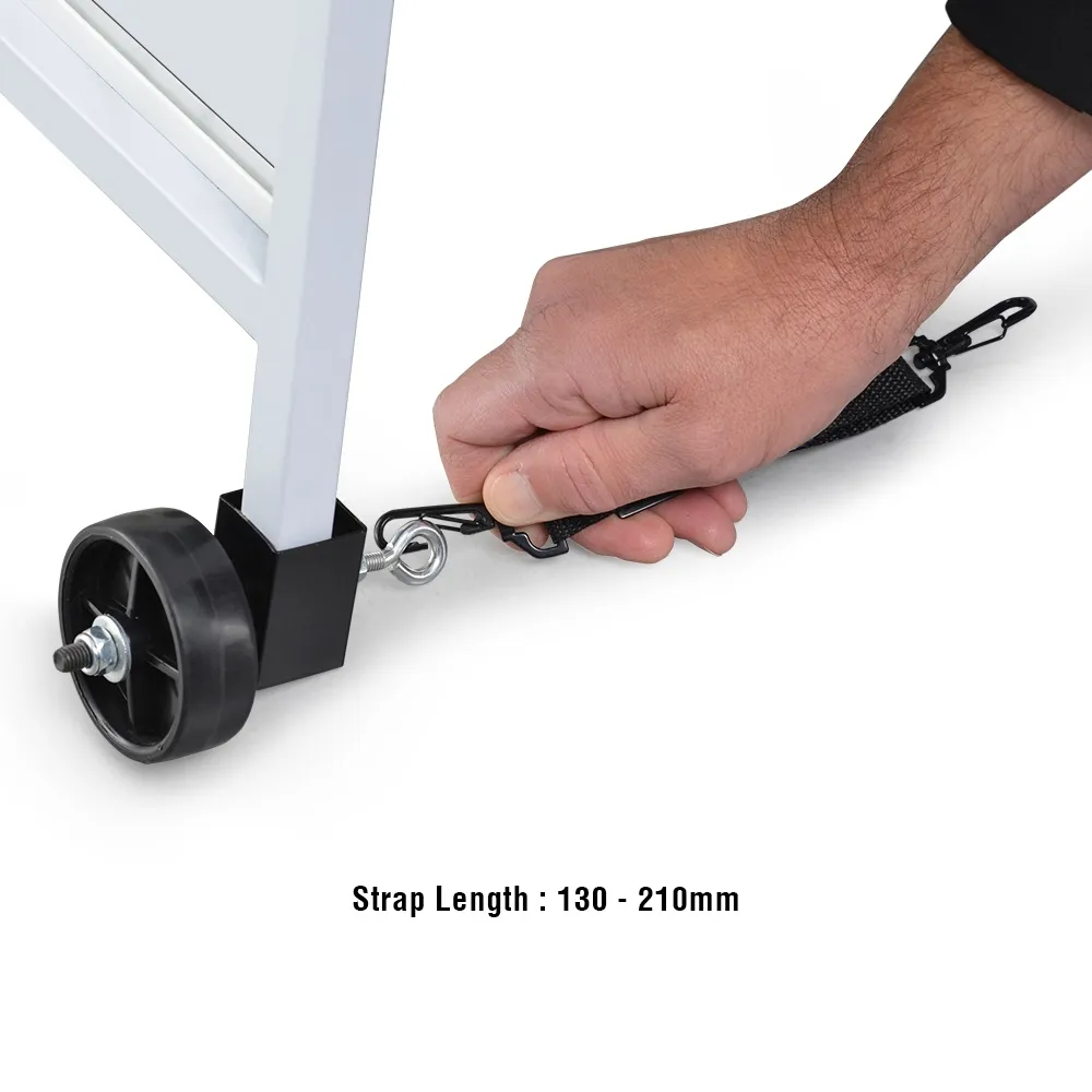 This A frame sign kit includes a variety of accessories for sandwich boards to help customise your display and make it even more useful for your business! This kit includes wheels that attach to the legs to make sandwich boards portable to decrease the load on employees! The hard plastic wheels attach to legs using steel tubes that are designed or rounded for squared legs up to 29mm thick. A second set of black steel tube connectors is also provided that works with legs up to the same dimensions, with all four tubes tightening using eye-hooks that also attach to the included straps.