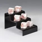 These black risers, like plastic stair sets, have polished edges for a premium look at a low price. Using acrylic instead of glass helps to give a low price that has the visual appeal of a higher-cost item with increased durability! This style of countertop display has been used by customers in many different businesses, including retail stores, jewellry shops, make-up counters, trinket stores, bakeries, and more. Use this stylish display today to help upsell your merchandise!