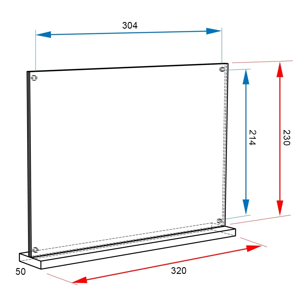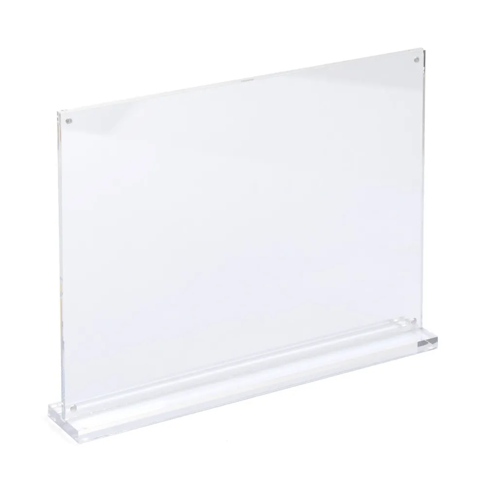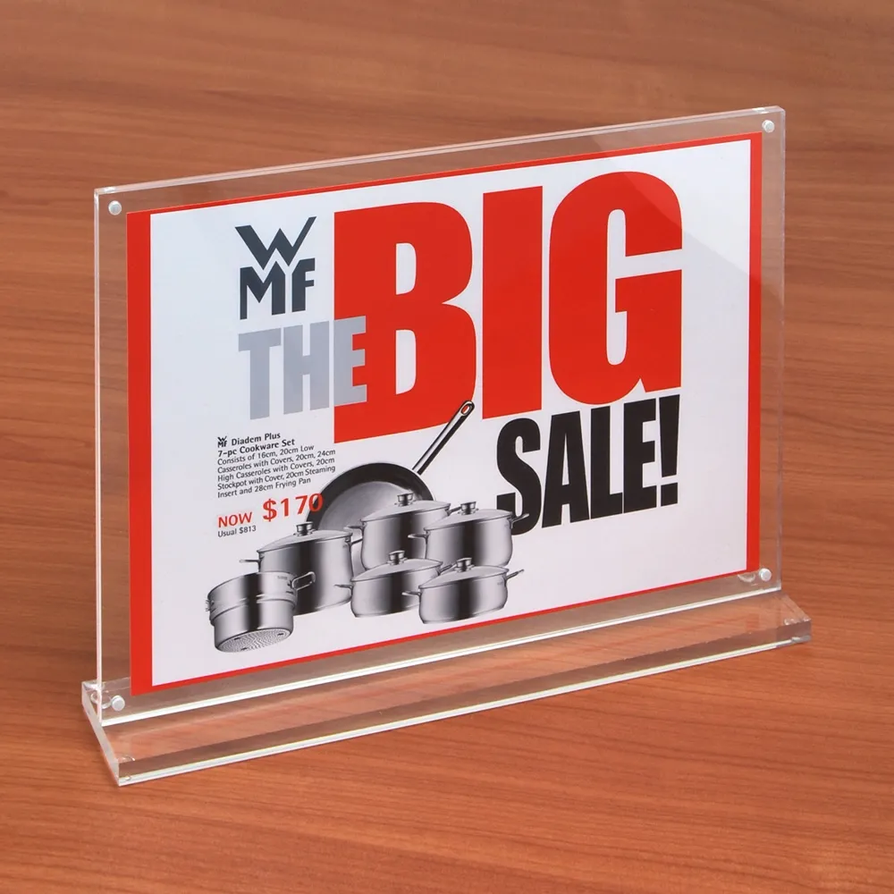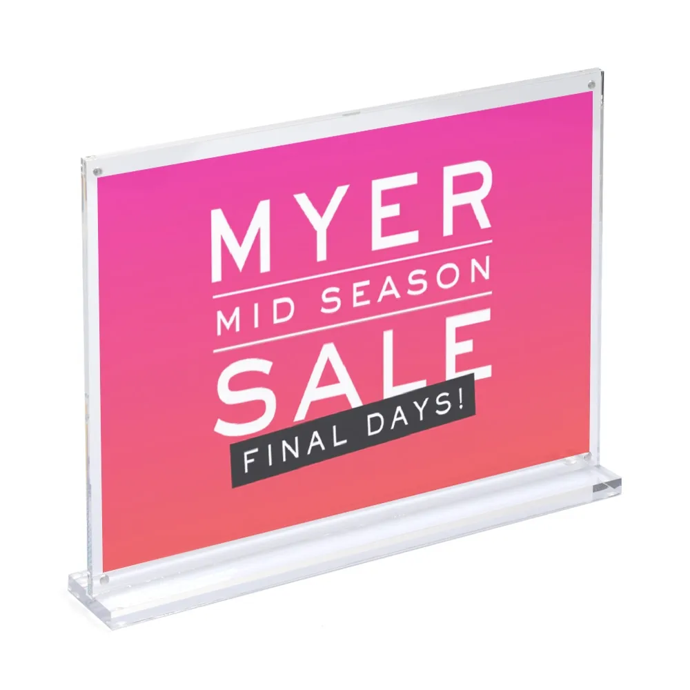 The sign holders, acrylic retail displays are meant to hold an A4 (297 x 210mm) standard sized graphic that is in landscape orientation, though any graphic that's this size or smaller works with this frame. The clear acrylic frame is 3mm thick, providing a premium unit that will help draw attention when placed on any counter, table, or desk. The base of the frame is made from 10mm thick acrylic that ensures a stable unit!