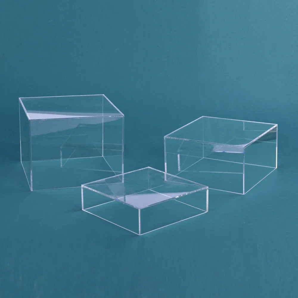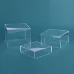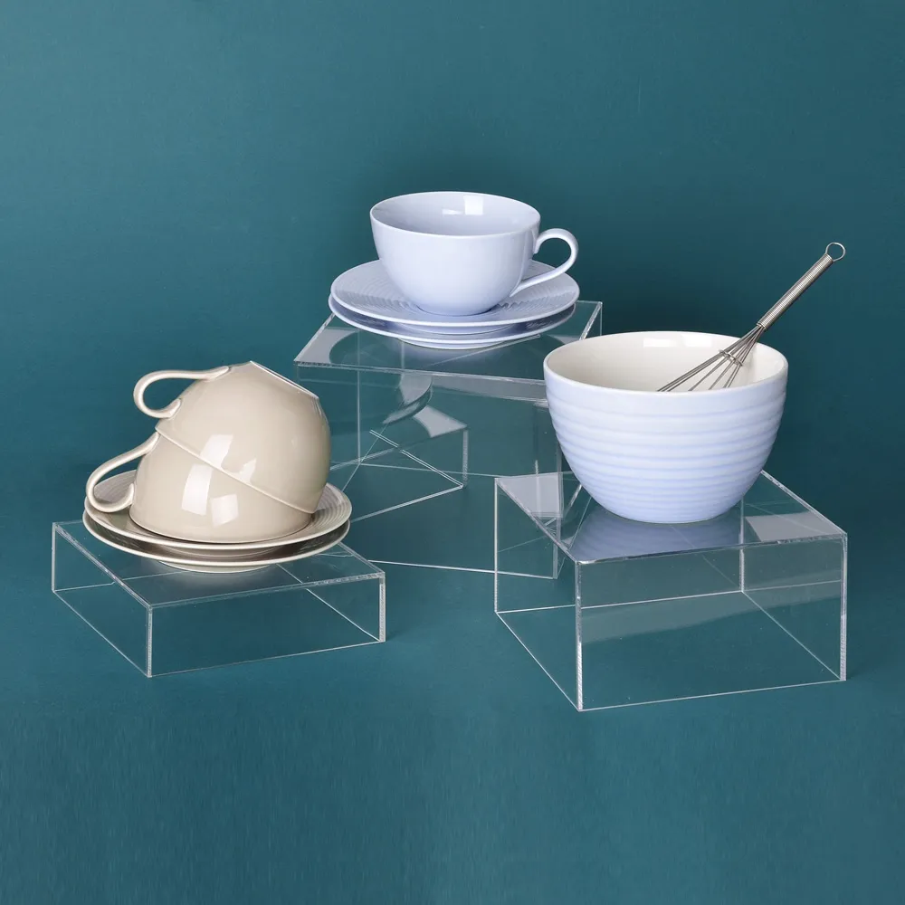 This jewelry display riser is a multi-purpose display, able to be used as both pedestals to elevate items and as containers to hold products and keep them in place. The acrylic store fixtures include (3) different sizes with the set, perfect for holding different products and highlighting them in unique configurations that will best capture the attention of passersby. This style of acrylic fixture is popular in many areas, including jewellry stores, make-up counters, retail stores, and restaurants, bakeries or cafes.