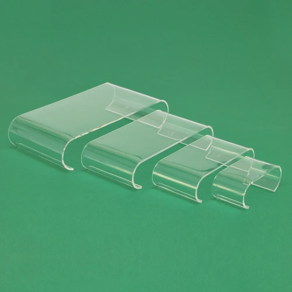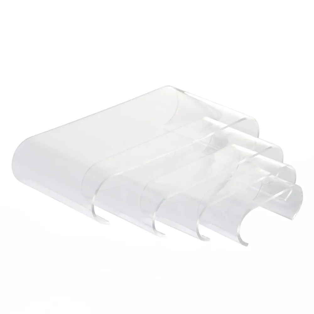 The retail lift display, clear perspex riser includes (4) different stands that are of various heights in order to easily support the needs of different businesses. A unique curved design helps draw the attention of passersby in towards what is being displayed on the stands. The polished edges on the display offer a professional look that works well within any décor.