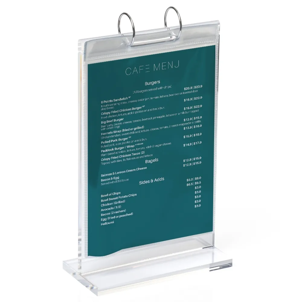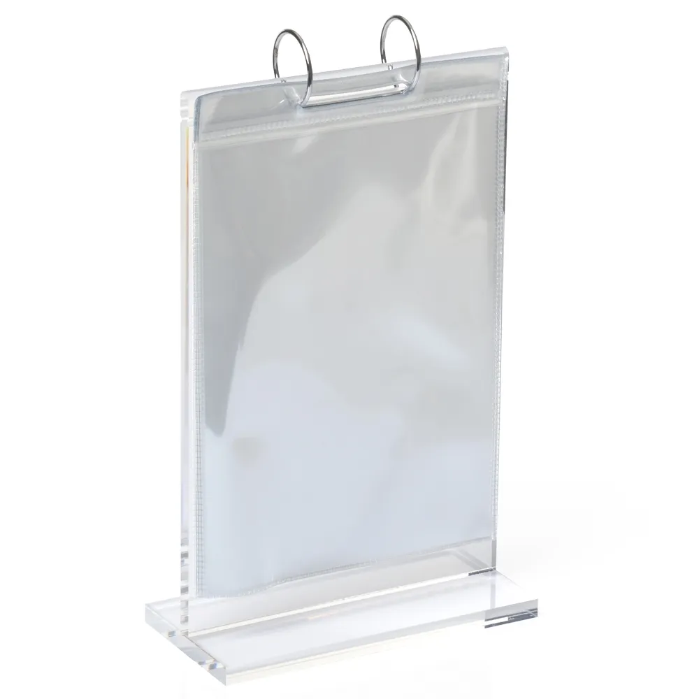 The base of this display is 10mm thick, providing stability when placed on counters, tables, and desks. There are stainless steel rings that hold the pages together through notches in the sleeves and make flipping through the displays very simple. These rings unhook with ease to access the pages by employees for change-outs, where graphics can easily be slid in between the sleeves!