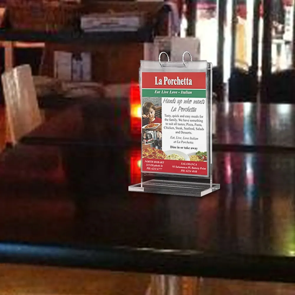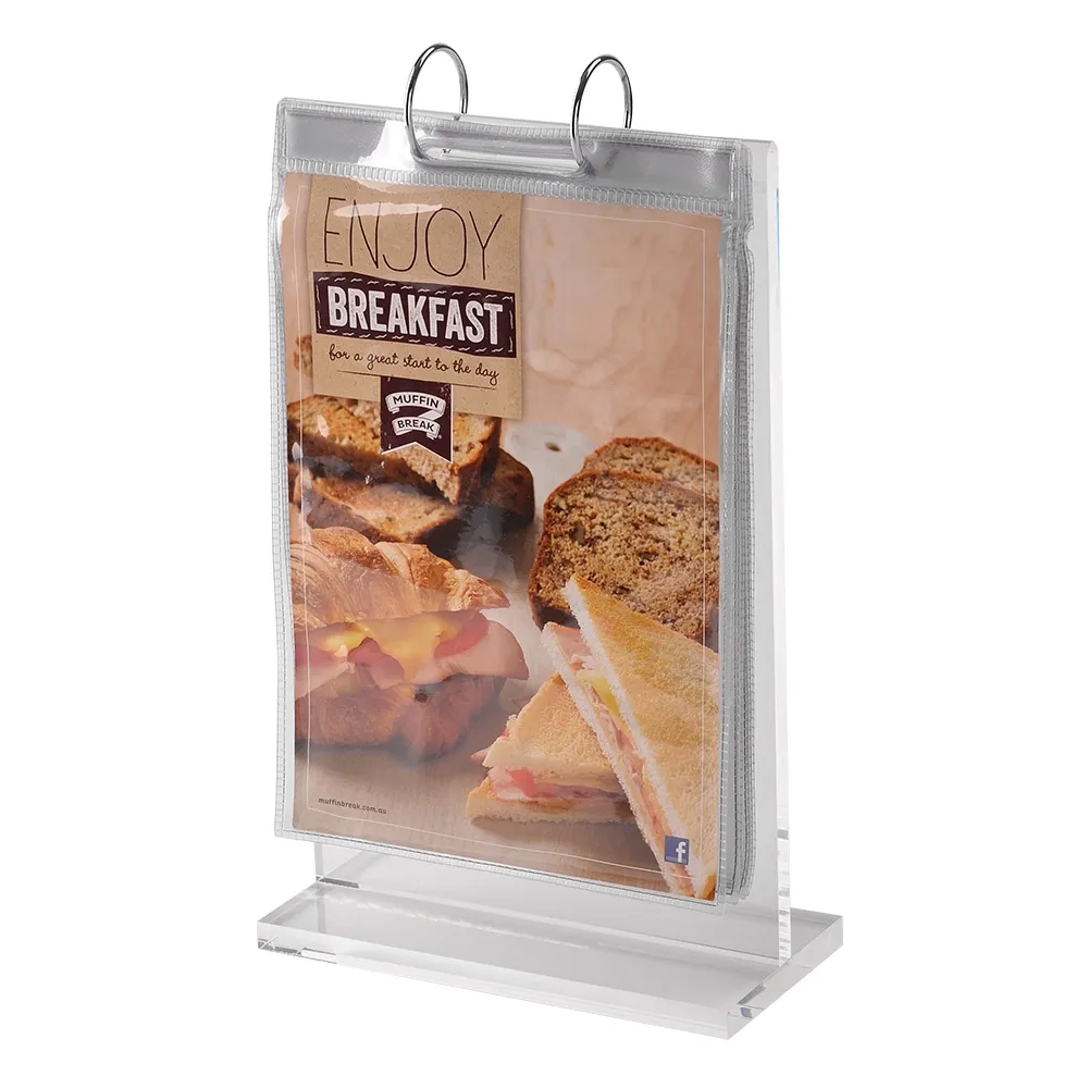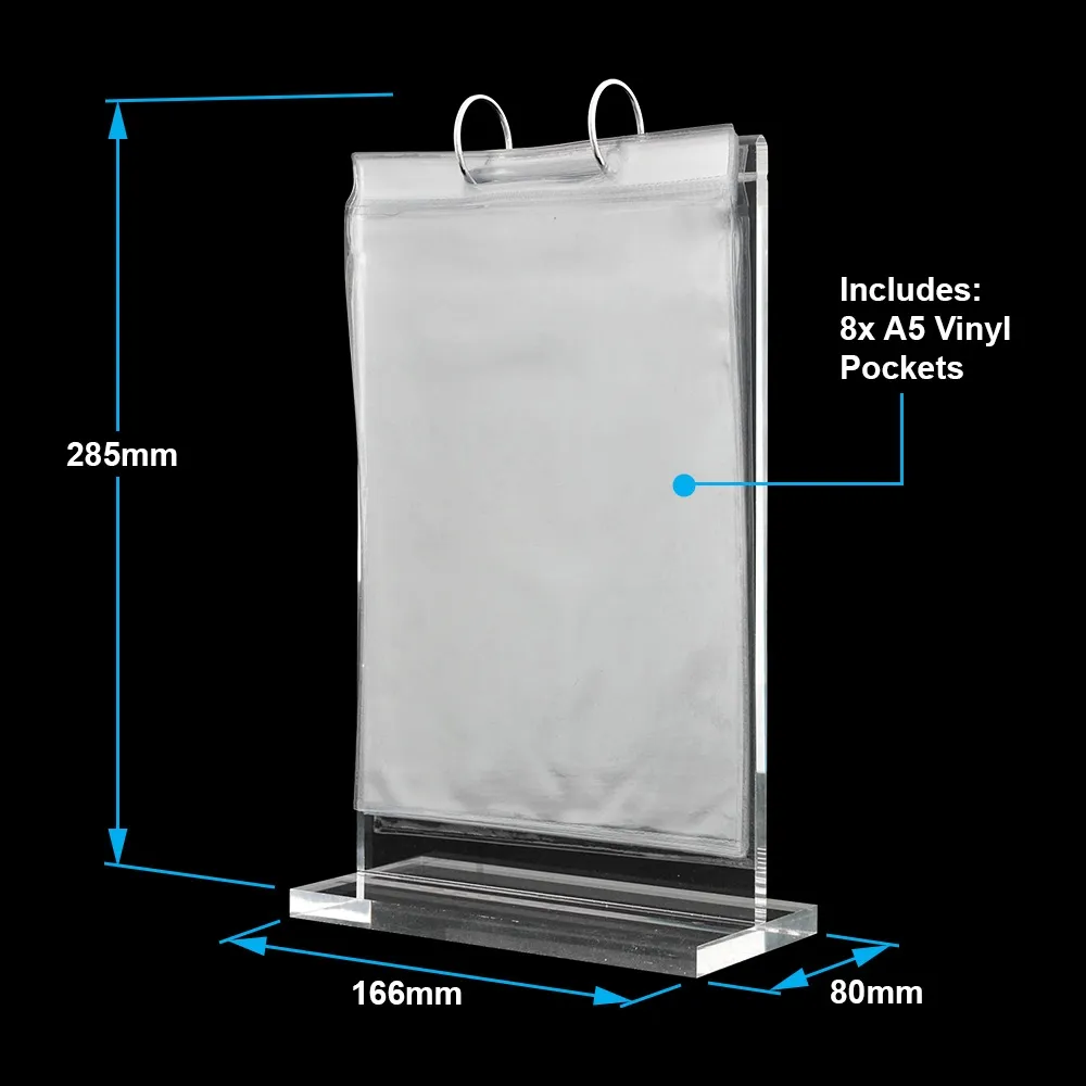 - Table menu stand holds A5 (210 x 148mm) standard sized menus or flyers within each vinyl sleeve