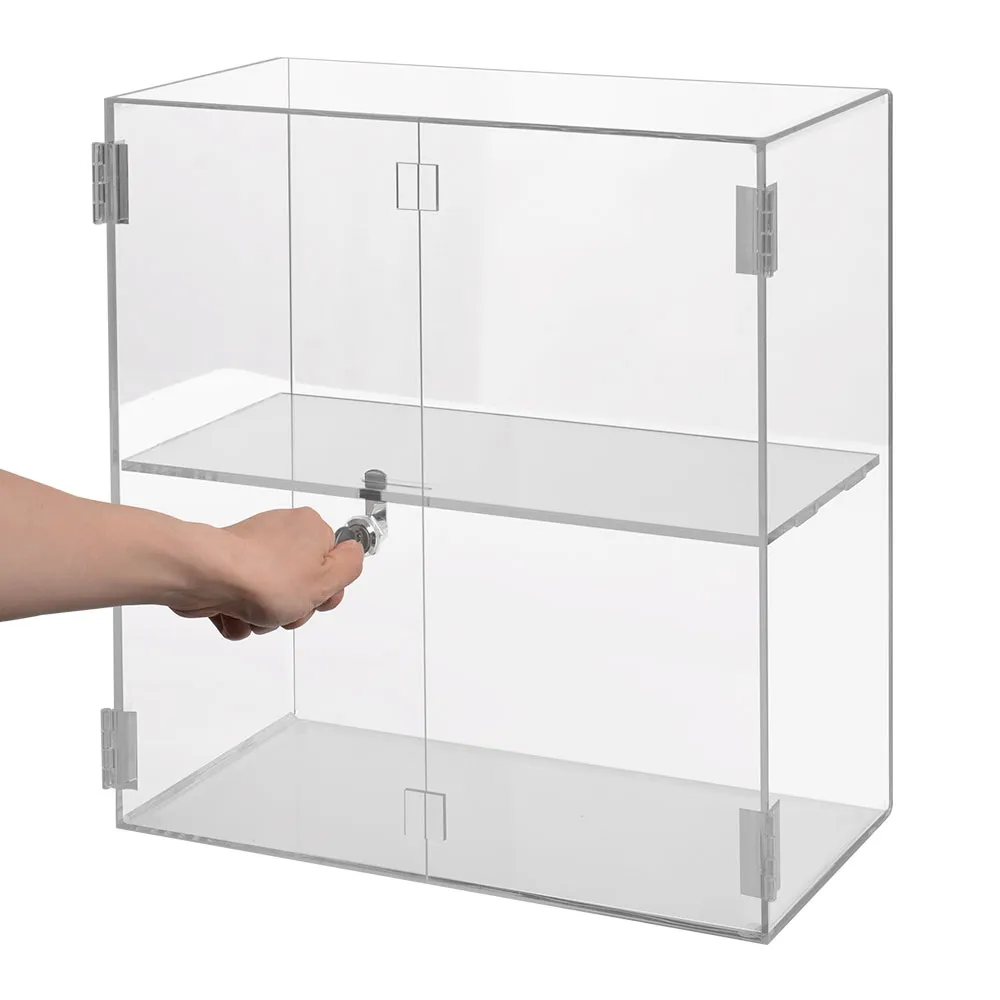- Countertop display case with lock uses camlock on rear doors to prevent unwanted access