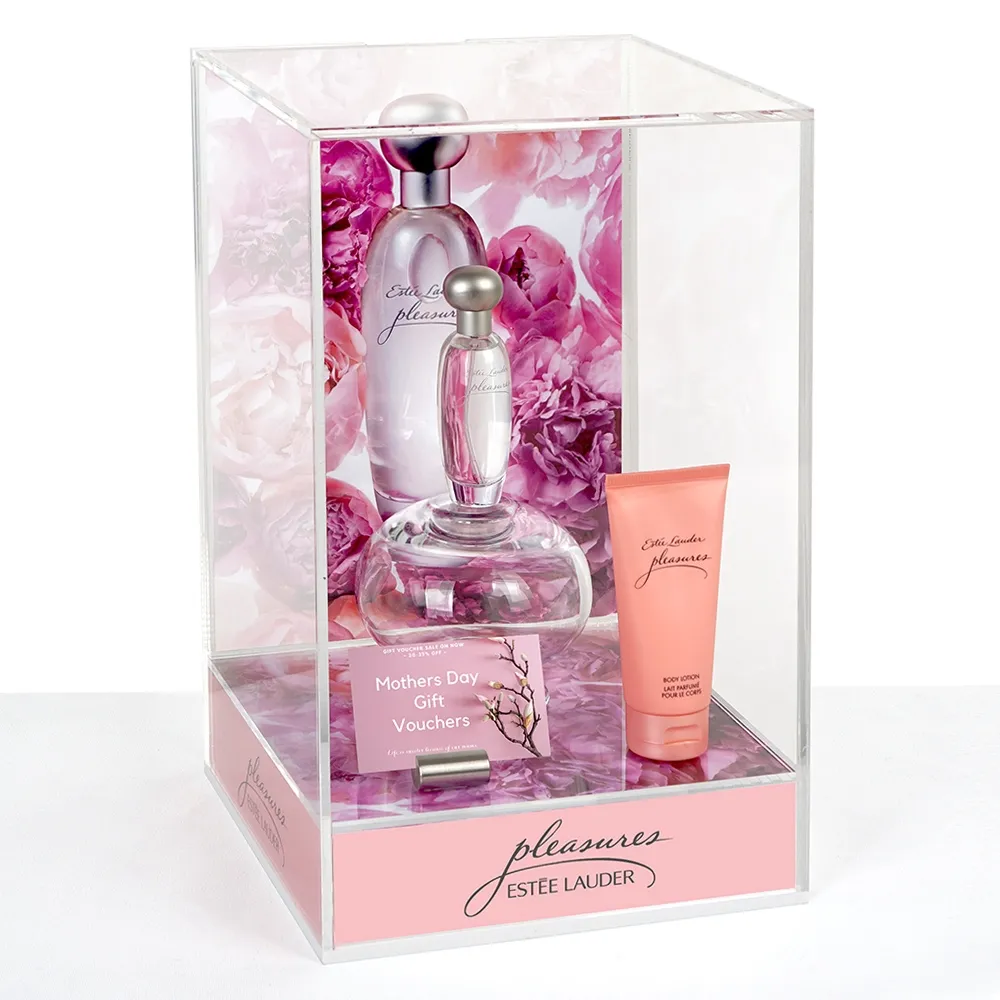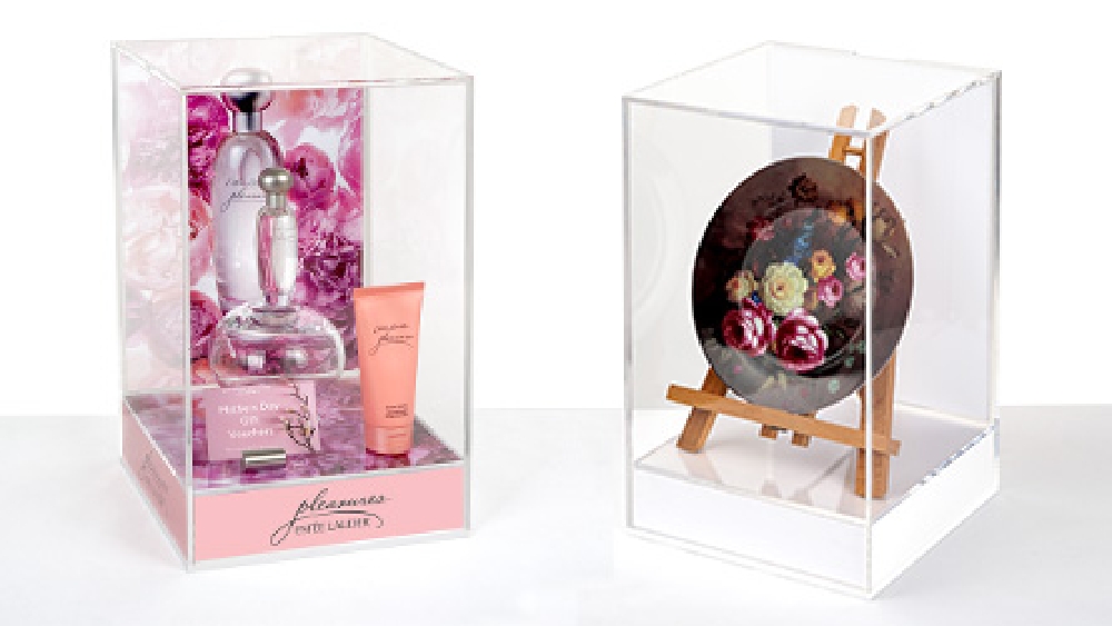 - Acrylic display box with lid is designed for countertop use at 365 x 230 x 220mm