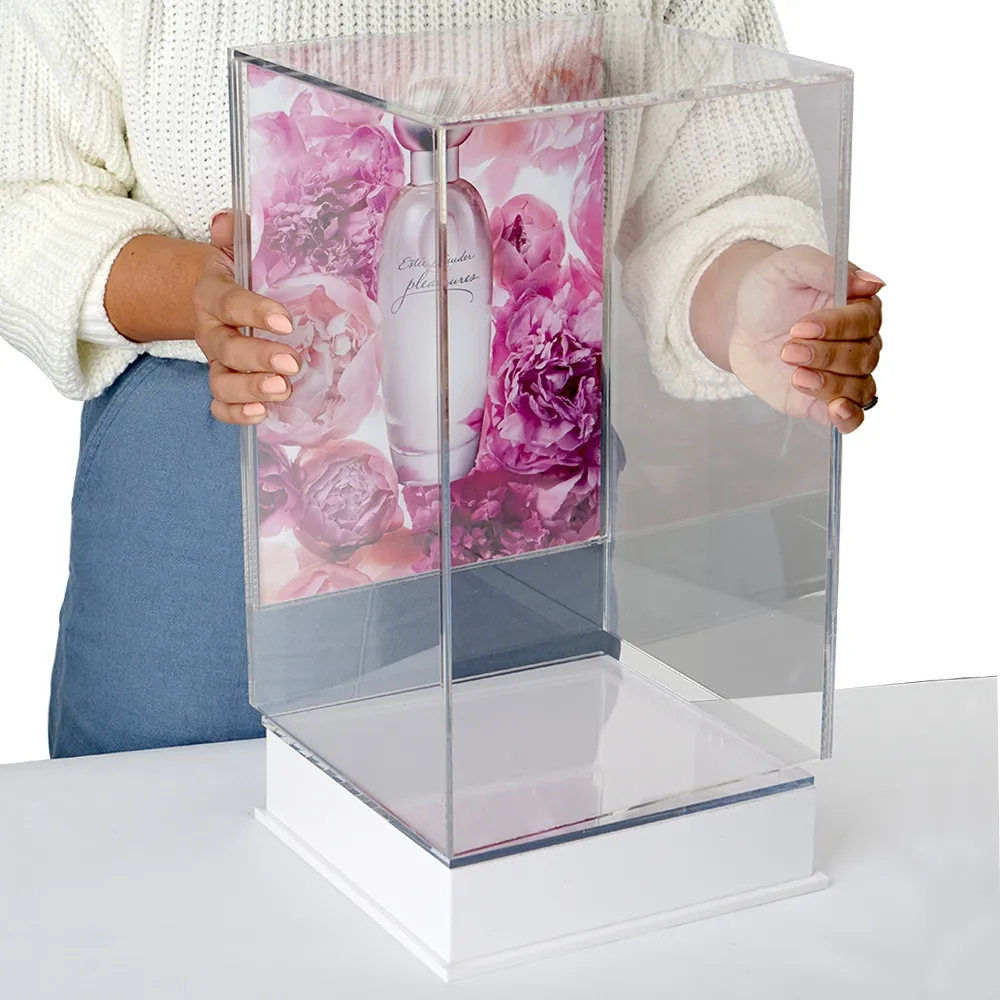 This acrylic display box with lid is used to display items safely, with this style being popularly used in retail stores, shopping centres, jewelry shops, and more thanks to the graphic holders that allow advertising! The back of the case is designed for an A4 (210 x 297mm) graphic in portrait format, perfect for creating a backdrop or displaying marketing information for the displayed item. The bottom pedestal can also have a graphic inserted into the holder, typically used in conjunction with the rear sign holder to better showcase smaller items. When a graphic is not used, the white finish of the pedestal offers a nice contrast to most displayed objects for better view.