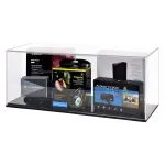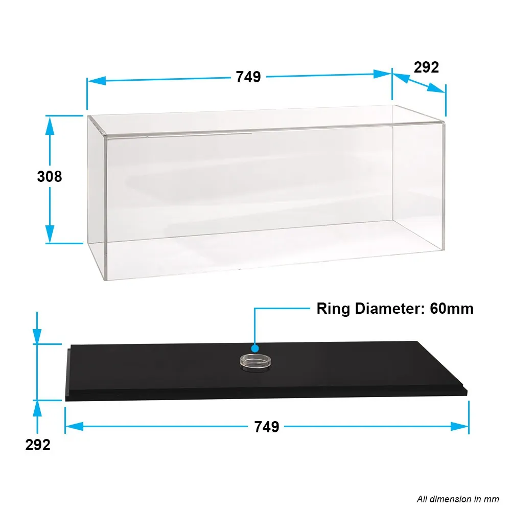The large acrylic display case includes a large black acrylic base with a ledge for the top of the case to rest upon and snugly fit. The clear plastic model display uses a 20mm thick base with a high gloss finish to ensure durability and to add style, with a slight reflection of displayed items making them look really special. This case is rather large, with exterior dimensions of 749 x 308 x 292mm, perfect for displaying model ships, assortments of baked goods, and memorabilia collections. The interior is 737 x 280 and can can display items up to 283mm tall inside without worry.