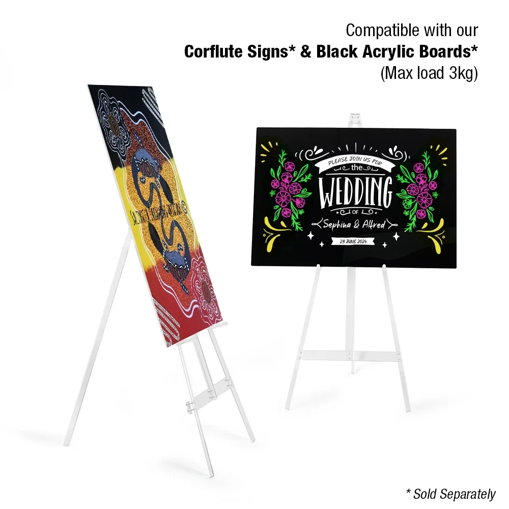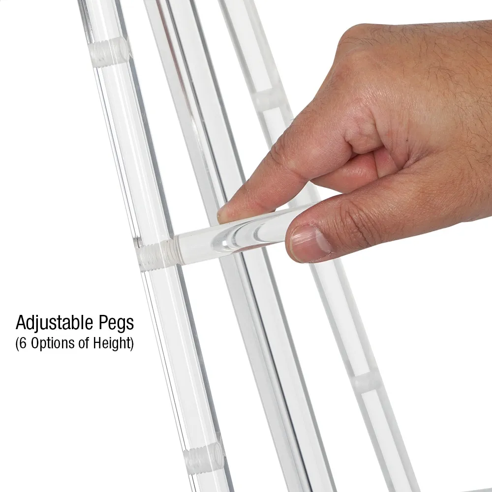 A perspex easel, acrylic easel has an adjustable design that makes placing posters at the best height for your audience easy. There are (2) 70mm long clear pegs that fit within set positions on each leg to support different sized items. These positions are spaced 80mm in six positions, with the lowest being 400mm from the ground. The pegs screw in by hand to ensure they remain in place. The pegs can handle a maximum weight of 3kg, perfect for displaying corflute posters or black acrylic boards which are available for purchase separately.