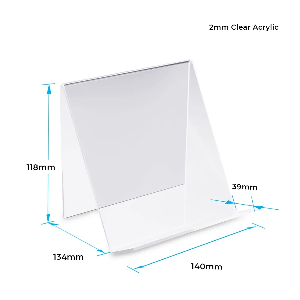This perspex display stand is a stylish way to present merchandise, brochures, or personal devices at a easy-to-view angle. Measuring 140 x 118 x 134mm, this slanted display is great for use on table tops or counters in cafes, museums, retail shops, and reception areas. The angled design helps to elevate displayed items, improving visibility and making information easier to read for customers or guests. Its versatility makes it well suited for showcasing catalogues, hero products, signage, and books in a tidy and space-saving manner.