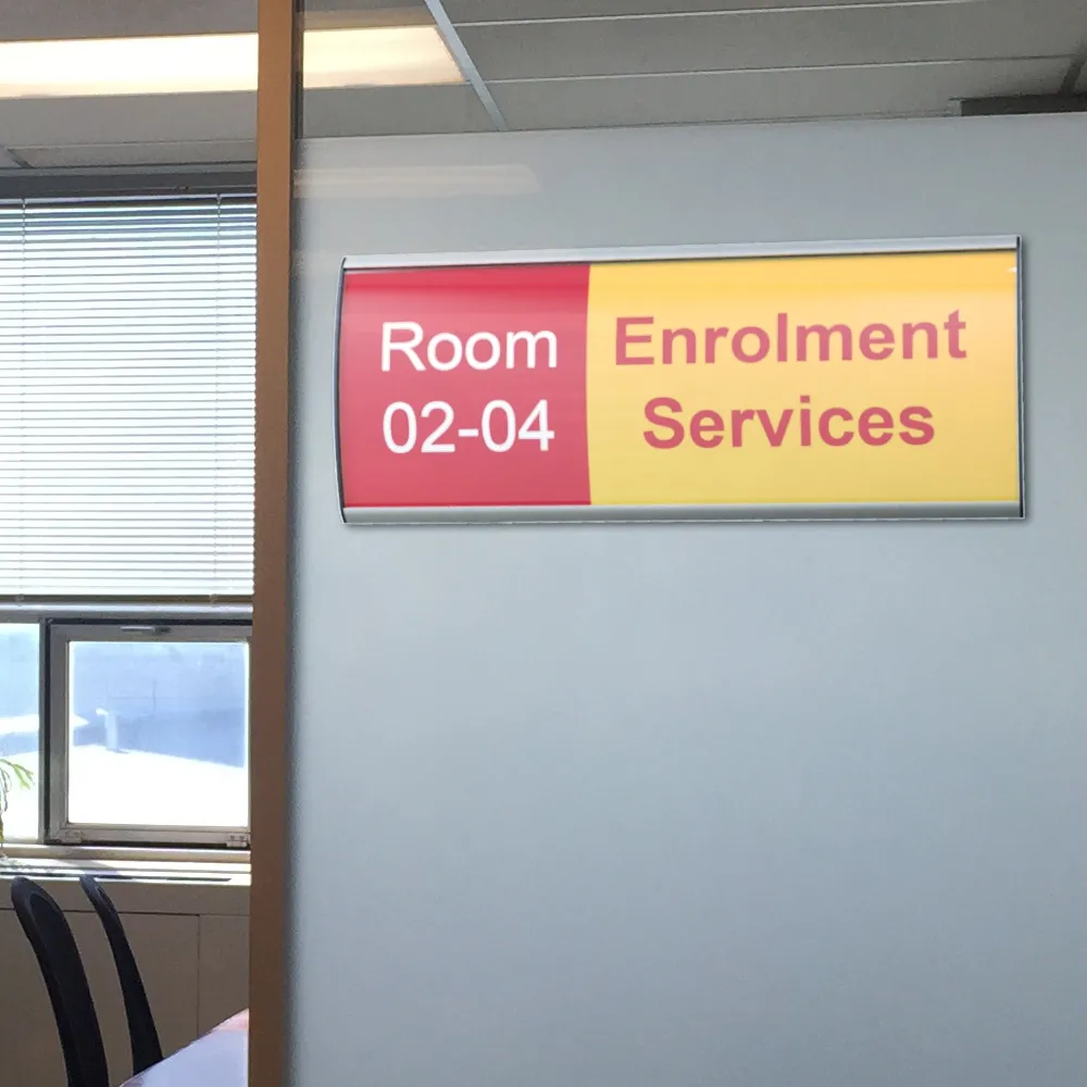 The office signage, wall sign is designed to hold a 148 x 400mm poster that can be mounted in both landscape and portrait orientation. This versatile display is perfect for displaying professor names at schools, as well as labeling specific rooms in conference centres and offices for easy navigation by employees and visitors. Switching out graphics requires less than 1 minute using the included suction cup tool to remove the lens!