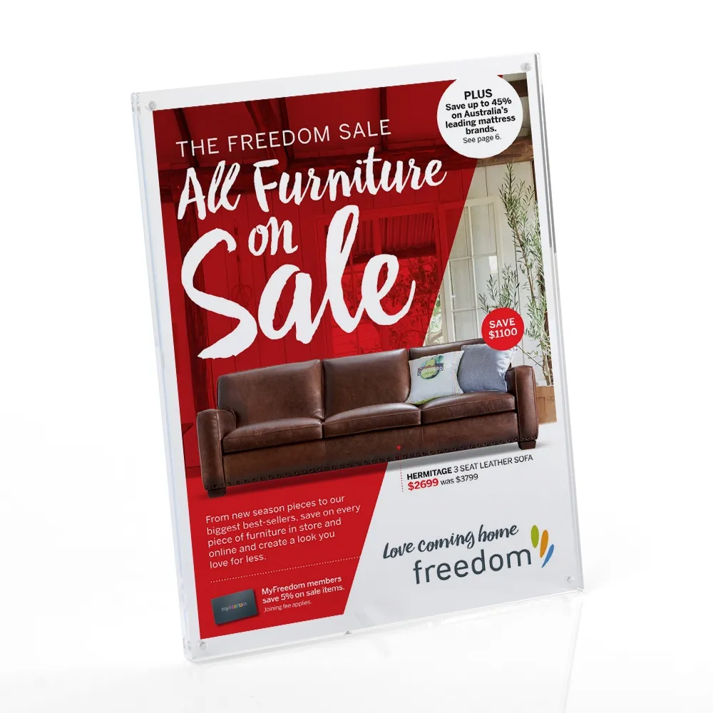 Plastic acrylic displays are a durable way of displaying advertisements for your customers to see in an eye-catching manner. The wide array of acrylic products we offer include different sizes & styles to accommodate the needs of any business!