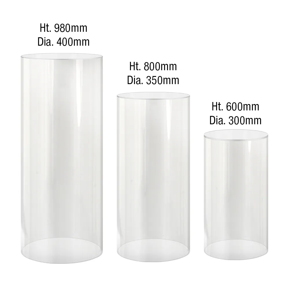 Round acrylic pedestals are a set of 3 individual plinths to showcase different items in a configuration that is suitable for your location! These plinths are made of clear perspex that offer a full view to the interior for a unique look. The open base allows decorations to be placed inside to create eye-catching displays that are appealing at weddings, retail stores, exhibition booths, office lobbies, hotels, shopping centres, and more! There are three heights included with this set: 60cm, 80cm,and 98cm to allow items of varying size to be displayed with ease.