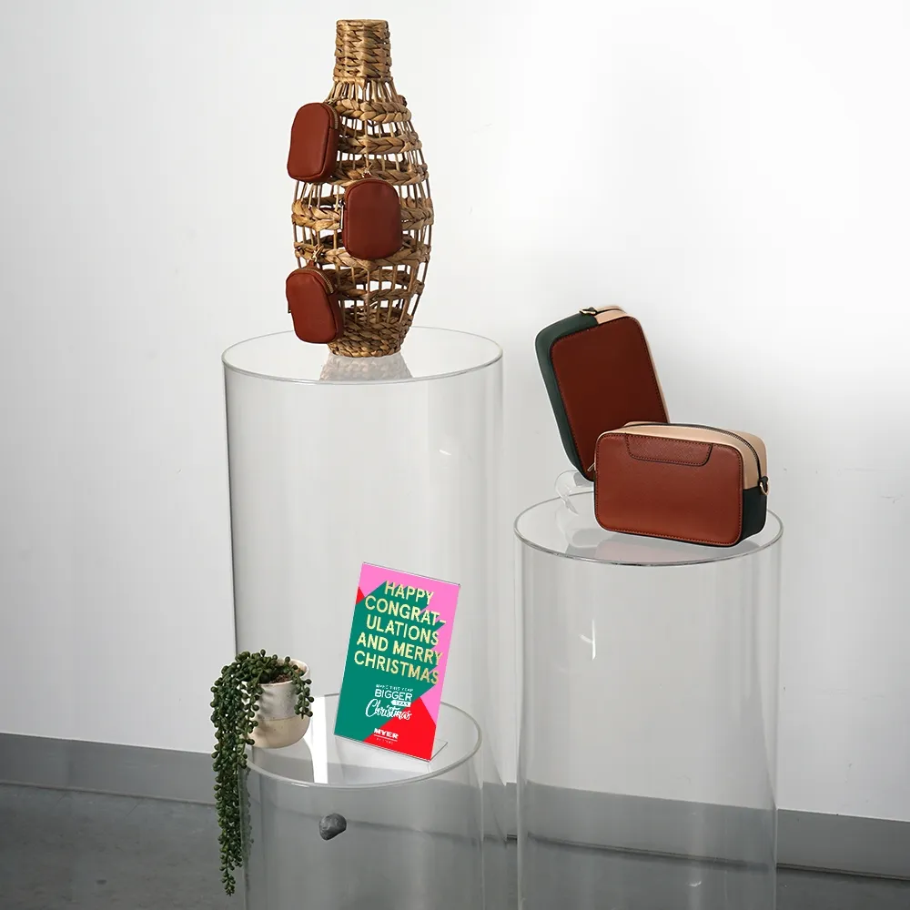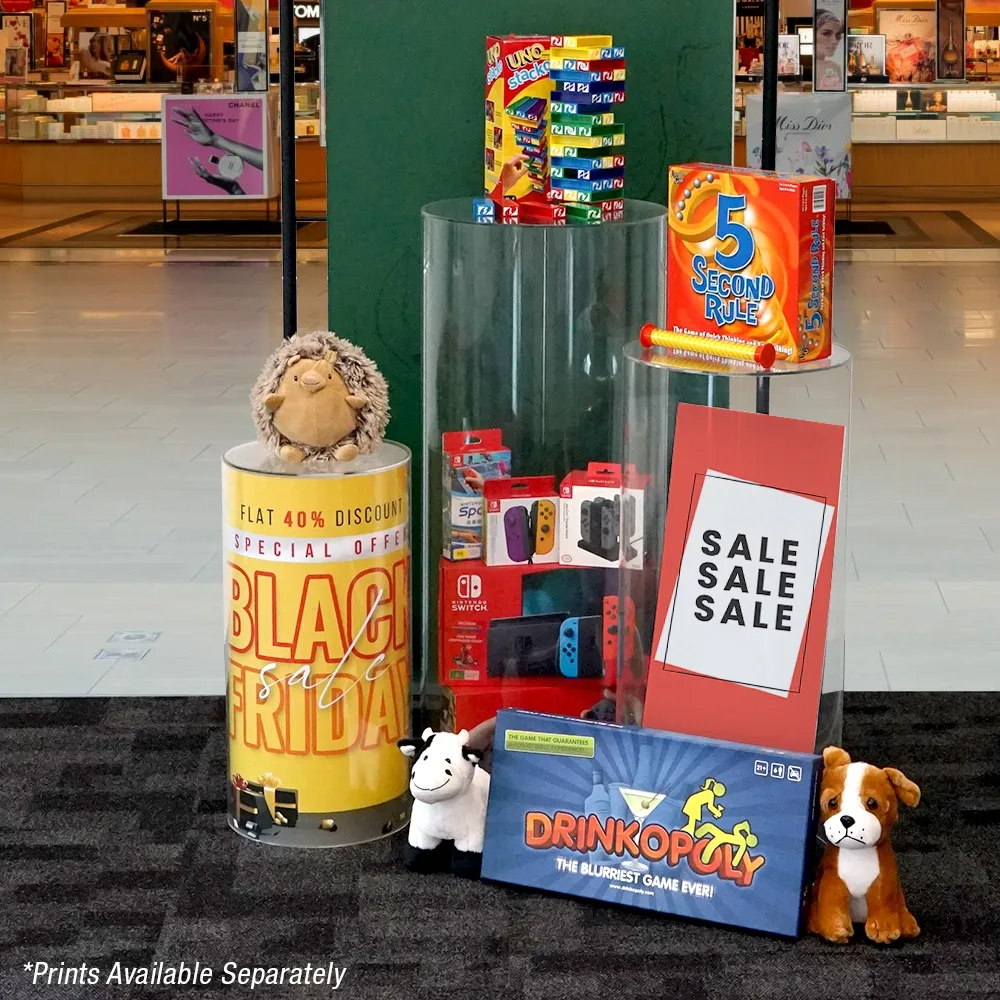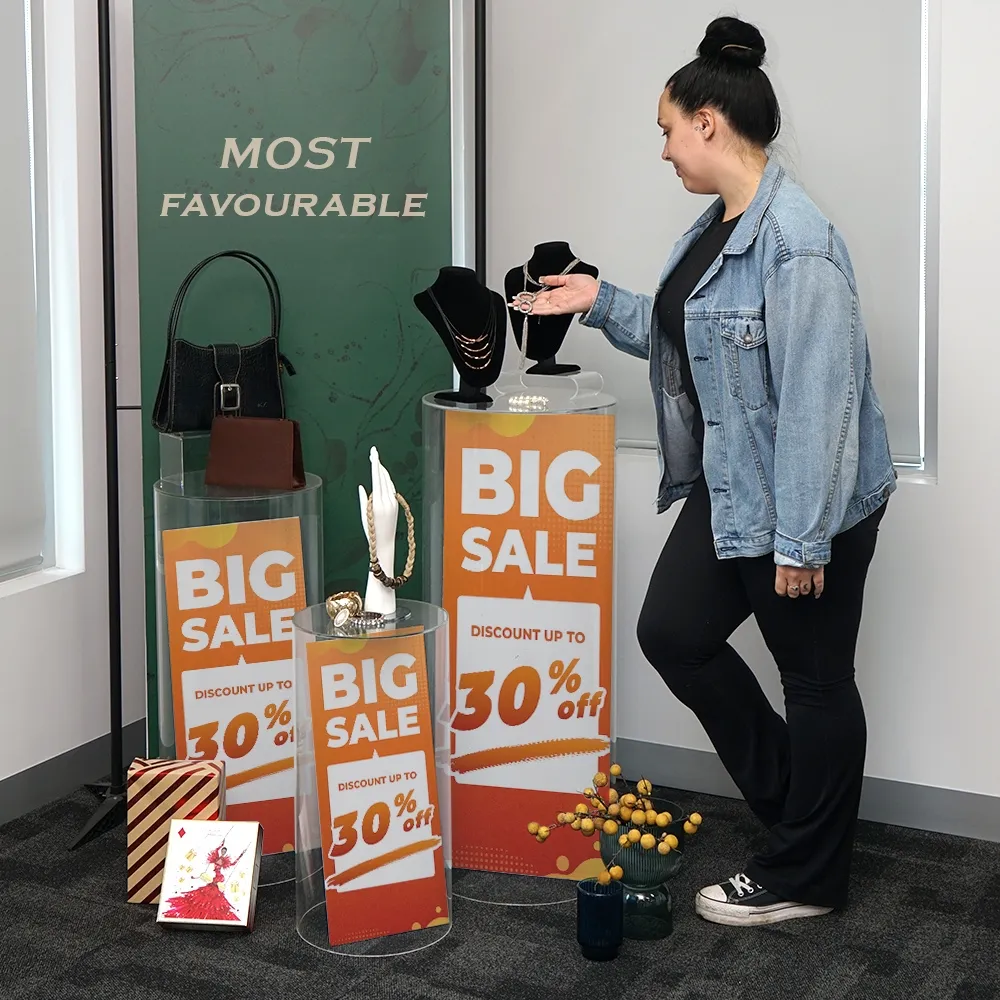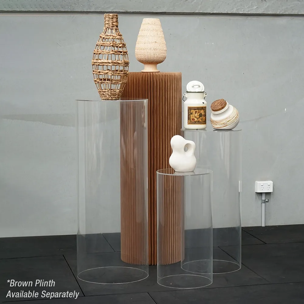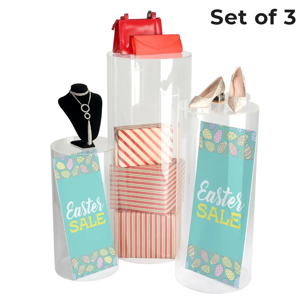 - Round acrylic pedestals have 3 heights in set: 60cm, 80cm & 98cm