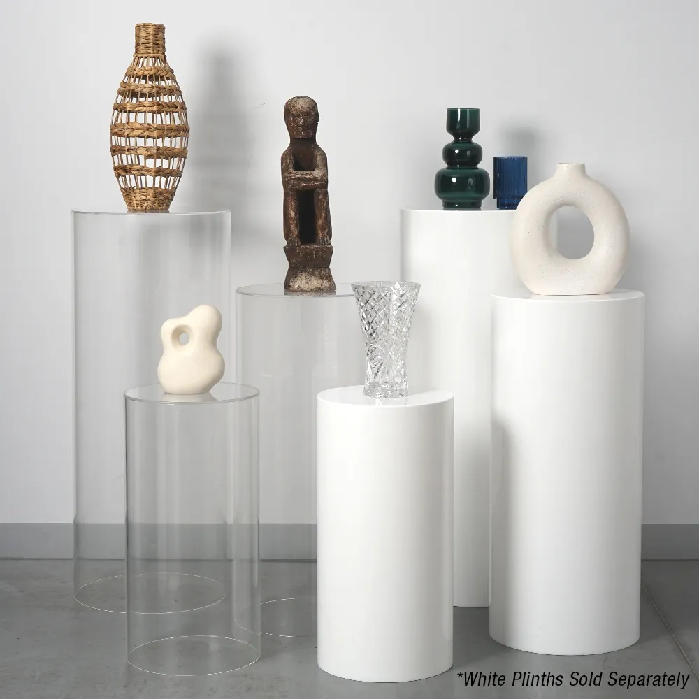 Cylinder stands, clear plinths, and other round acrylic pedestals have a 30kg weight limit per stand to easily accommodate typically displayed items. The plinths have different diameters depending on height, with 30cm, 35cm, and 40cm surfaces ranging from shortest to tallest. The cylinder design provides displays that not only look great but are safe for use in public spaces thanks to no sharp edges. Additional plinths can be purchased individually and there are other finishes and styles available as well to create displays that are suitable for your location's style.