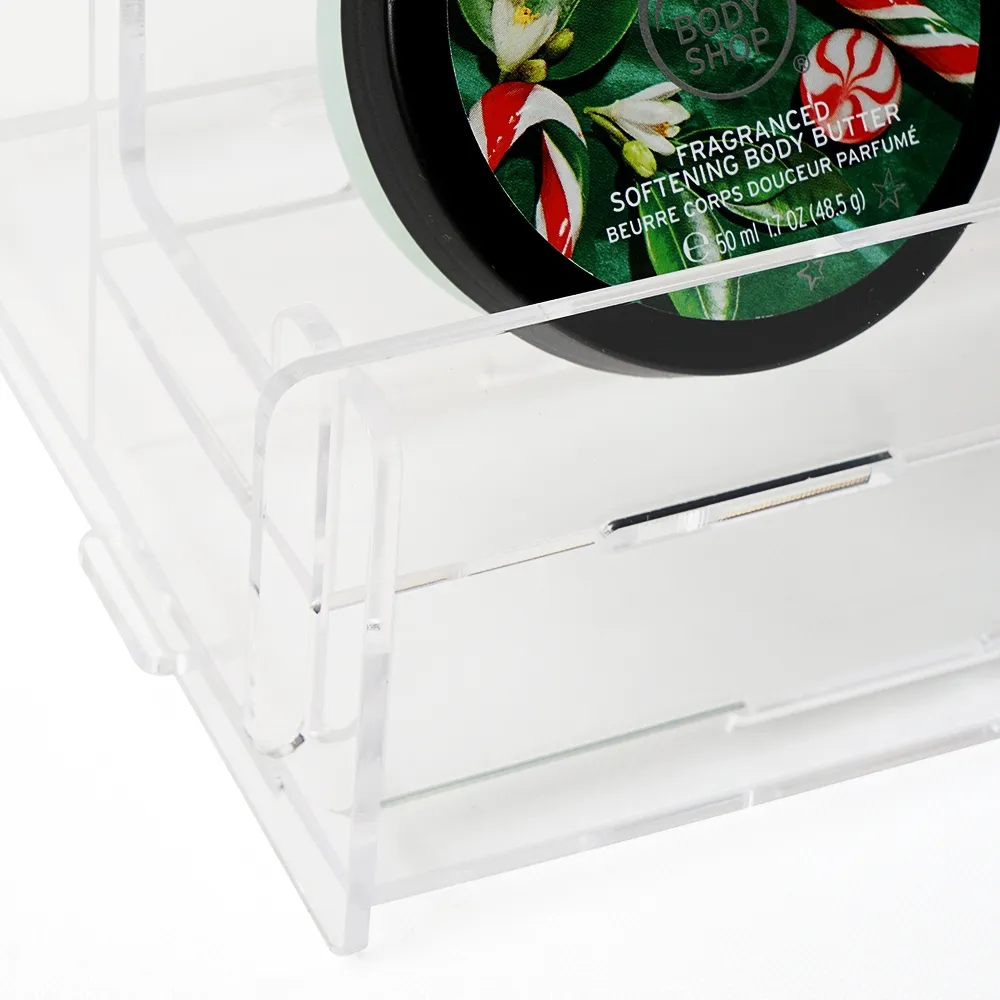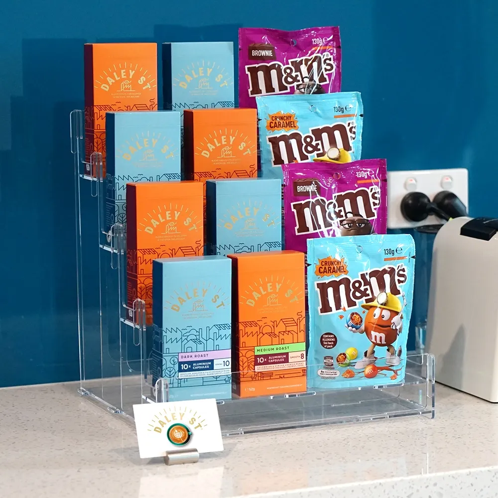 - Acrylic display riser feature (4) tiers for separating products for easier viewing