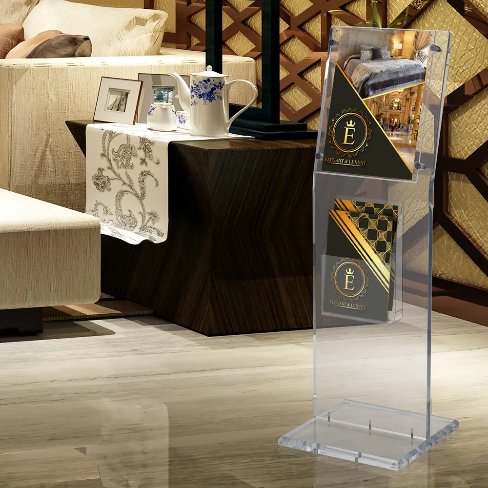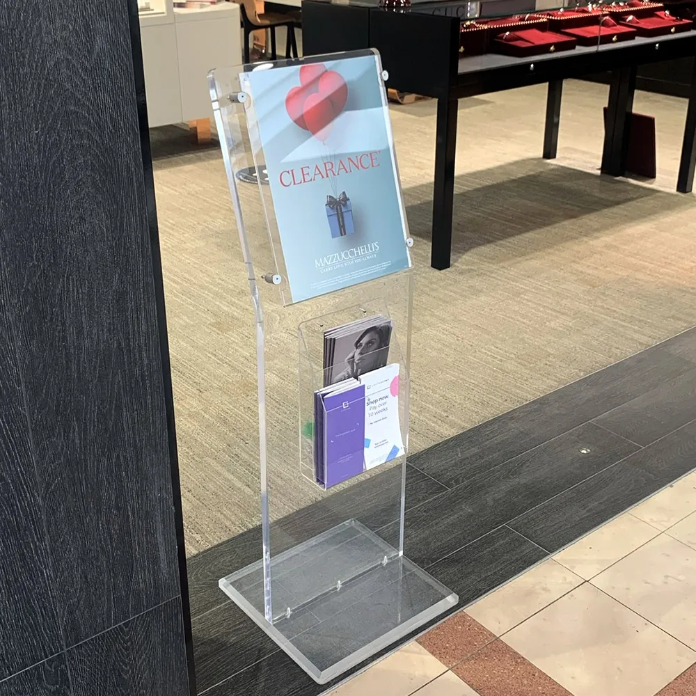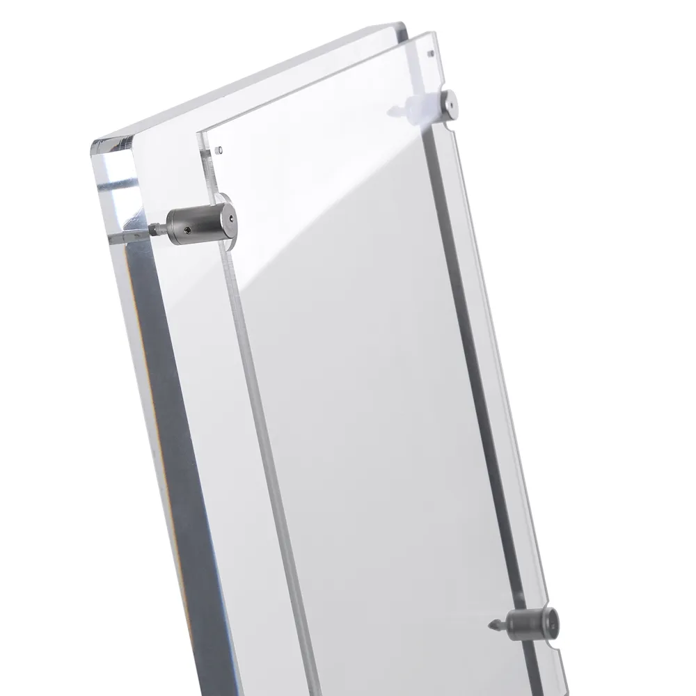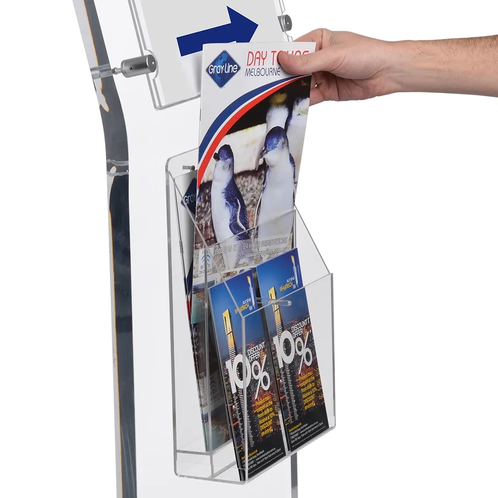 These stand up sign holders have a beautiful aesthetic, drawing customer in using a clear acrylic panel that will direct them towards your displayed advertisement. The clear acrylic brochure stand features a clear pocket with removable dividers for holding different sizes of take away literature for customers. A4 (210 x 297) can fit within without the dividers, and (2) DL (210 x 99mm) can fit when the divider is in place.