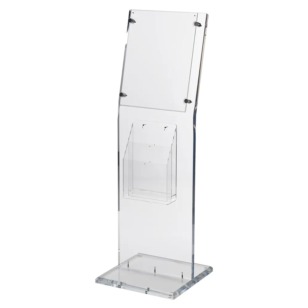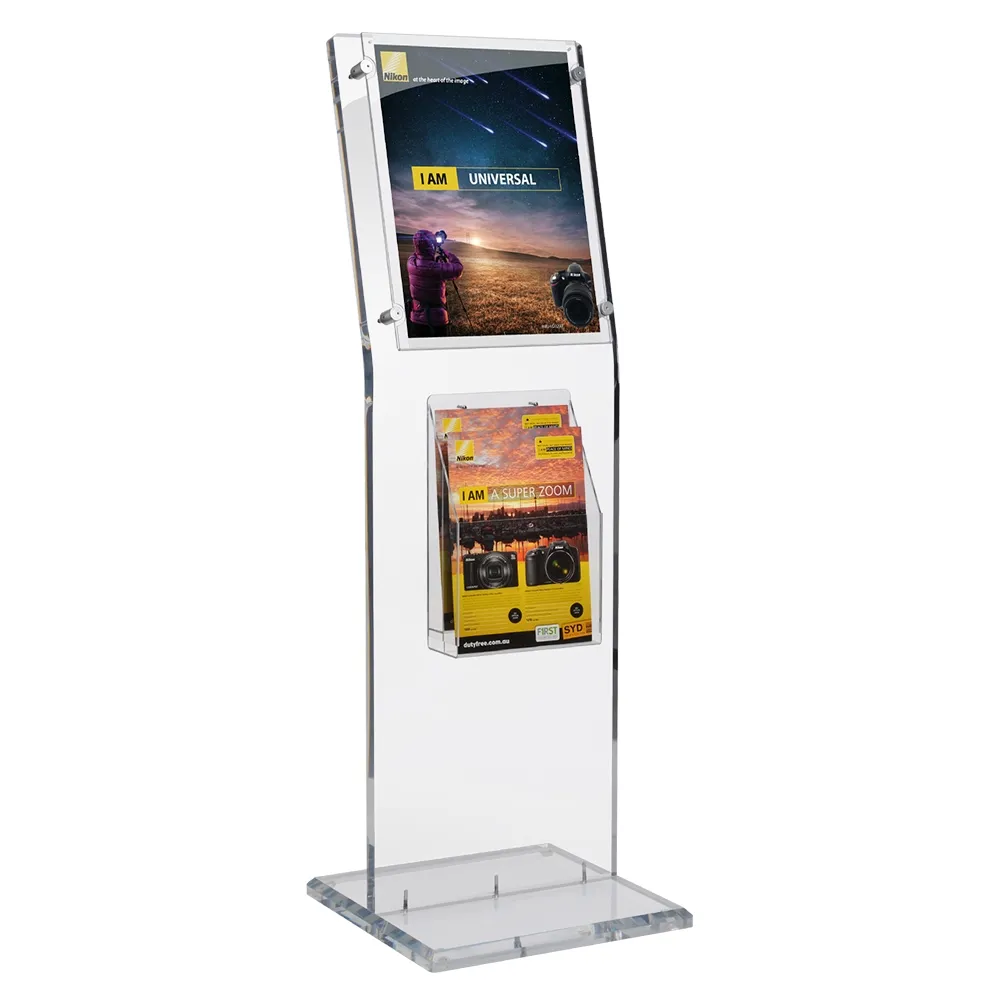 These floor standing brochure displays, stand up sign holders also have a signage holder on top of the stand. The slight angle adds to the modern appeal of the stand, and edge grip stand offs hold the poster holder in place. A3 (297 x 420mm) sizes signage in portrait format fit within the holder, and the simple lift-off design makes switching out posters fast and easy. The 25mm thick display is sturdy, with polished edges for a glass-like look.