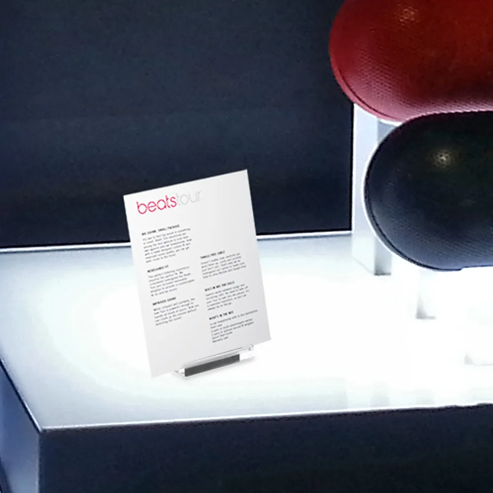 This promotional card display, plastic ticket holder makes it easy to place information around your business in a stylish manner. A card holder can be placed next to baked goods in a cafe's case to detail what is being displayed, show brand information next to various items in a jewelry store, and even at art galleries to denote selection names.