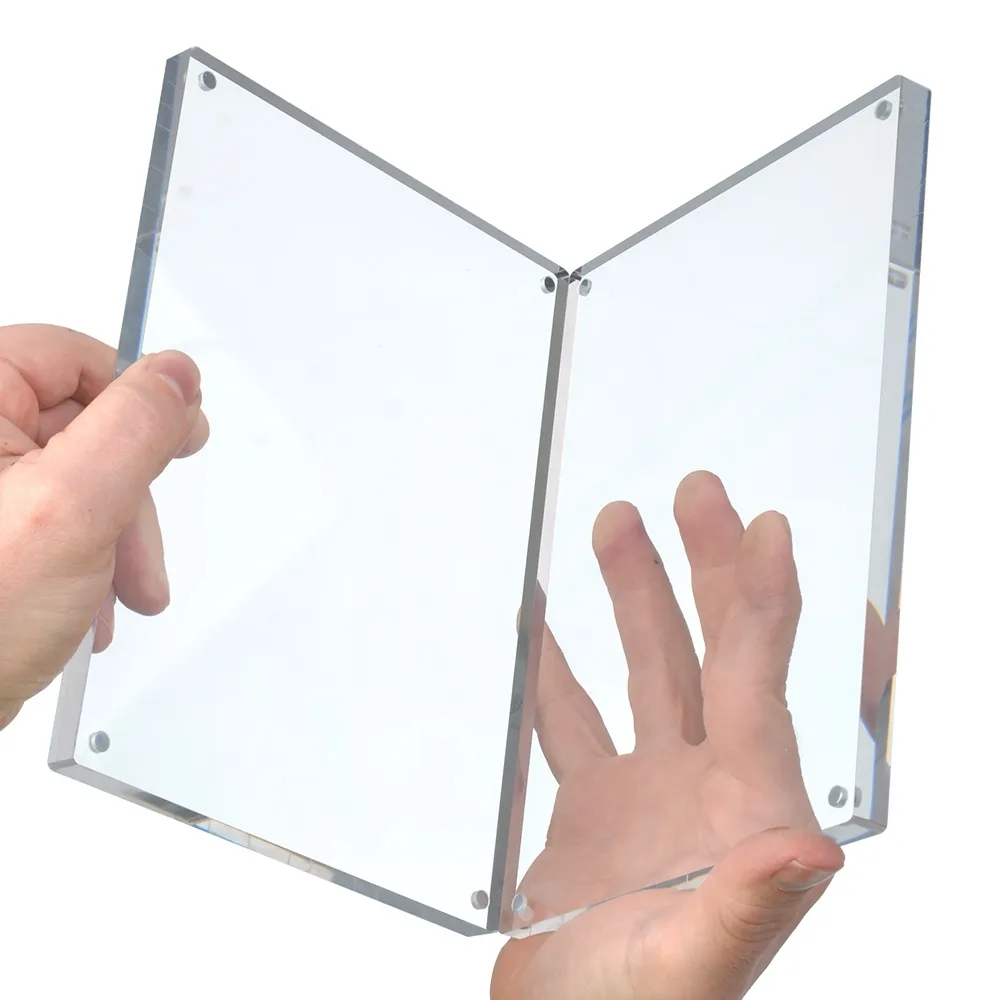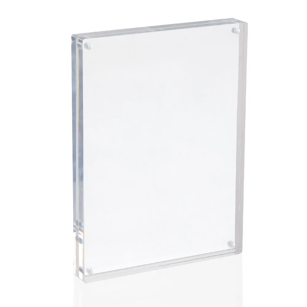 These thick Perspex frames have an aggressive magnet embedded in each corner of the acrylic frames. Your poster or picture is sandwiched securely between the plastic frame and the 20mm thick edge of the frames ensures it stands stable on any flat surface.