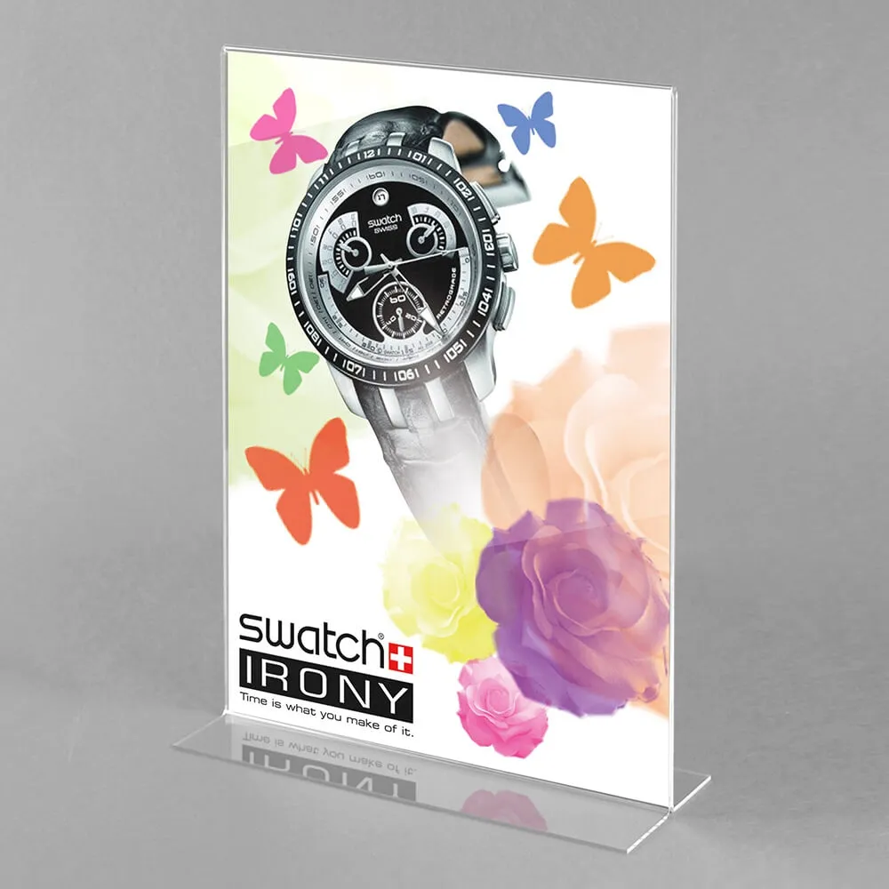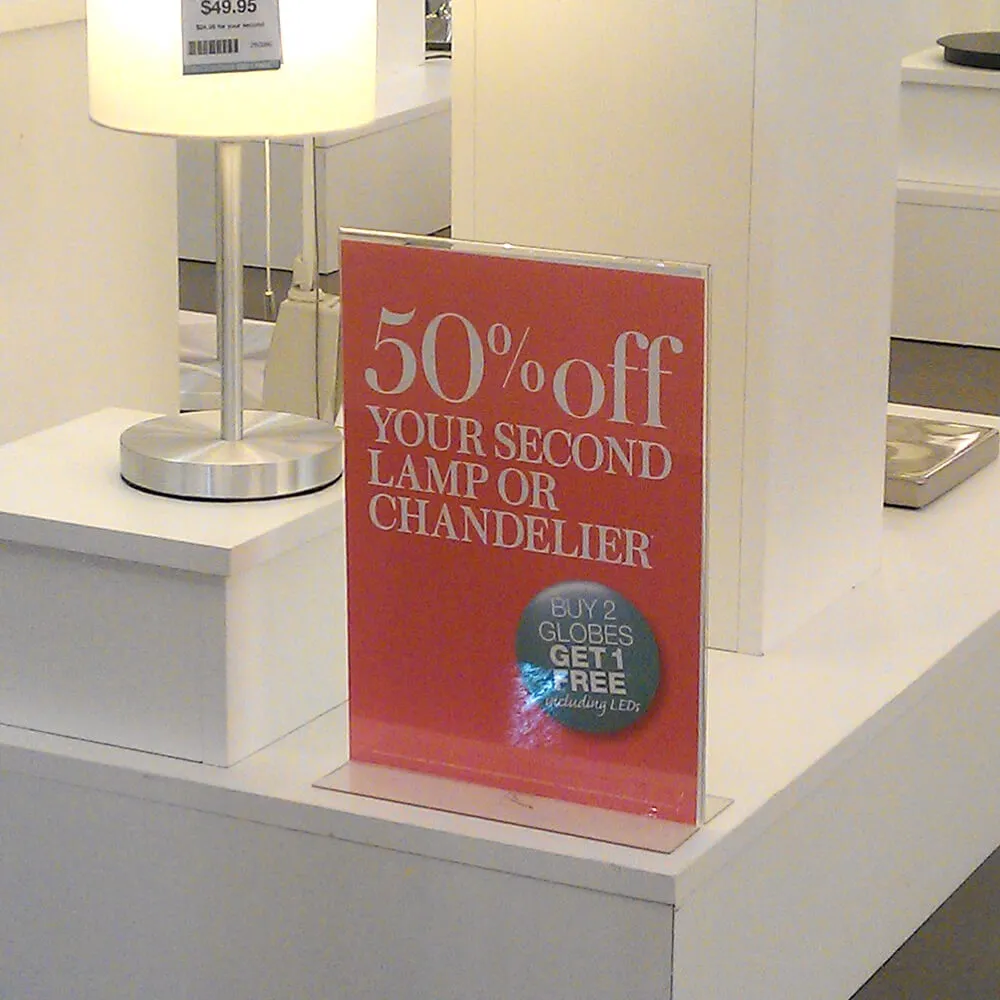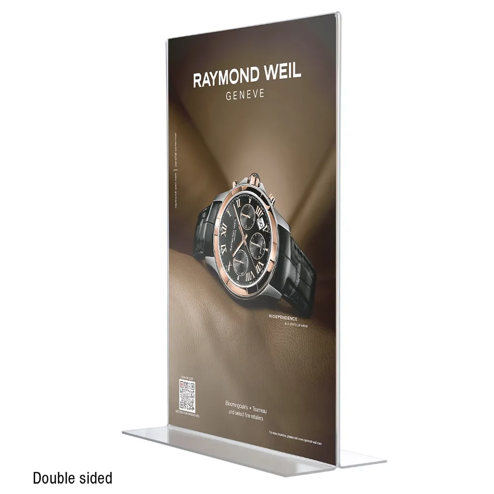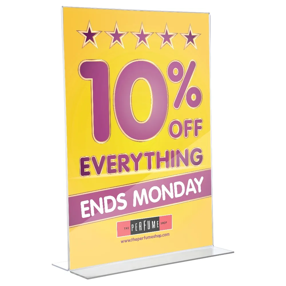 Double sided acrylic sign holders are the cheapest and easiest way to add signage to your premises. They are ideal for use on shelves, counter tops, or anywhere that your promotional messages need to be changed or moved regularly with accordance with what’s in stock or on special.