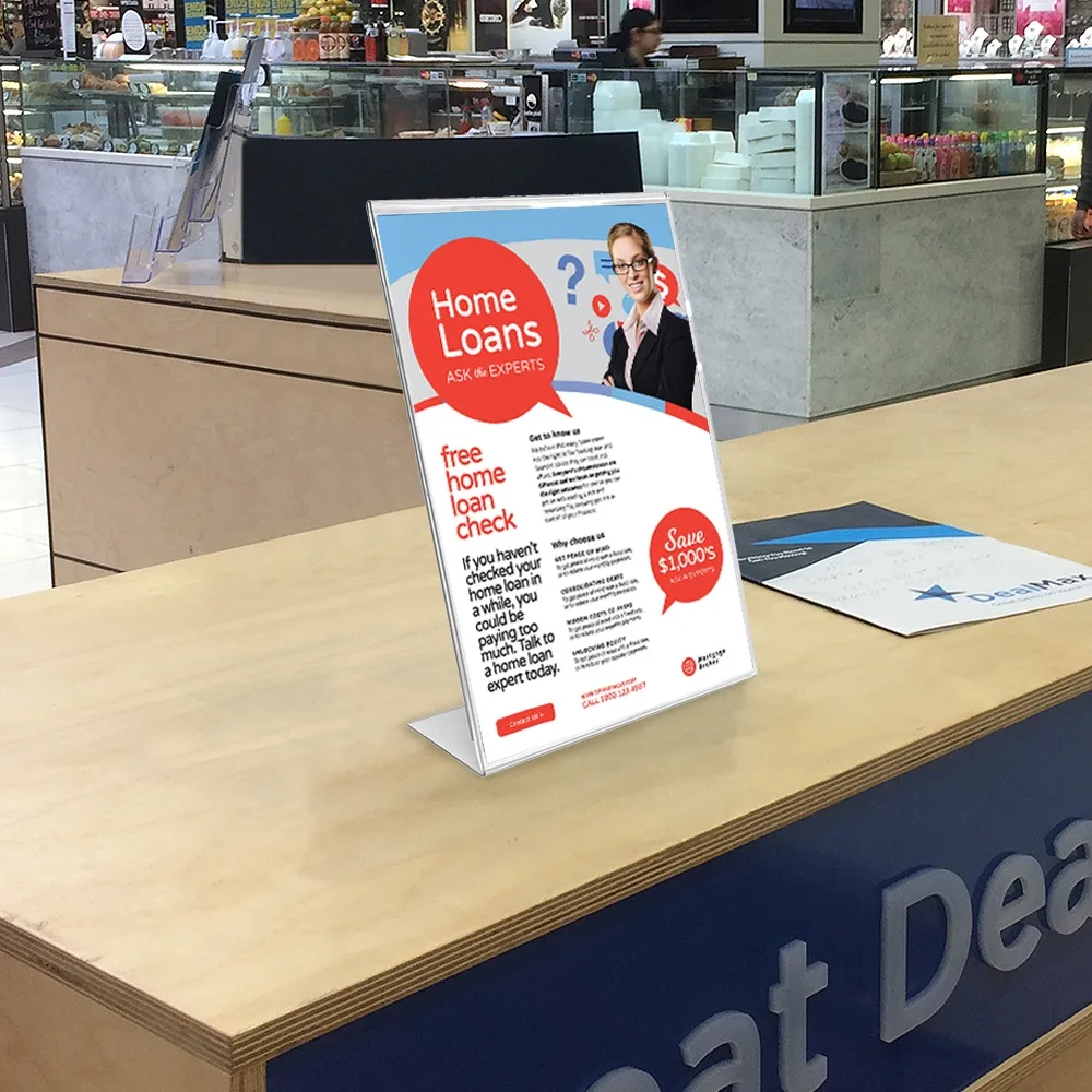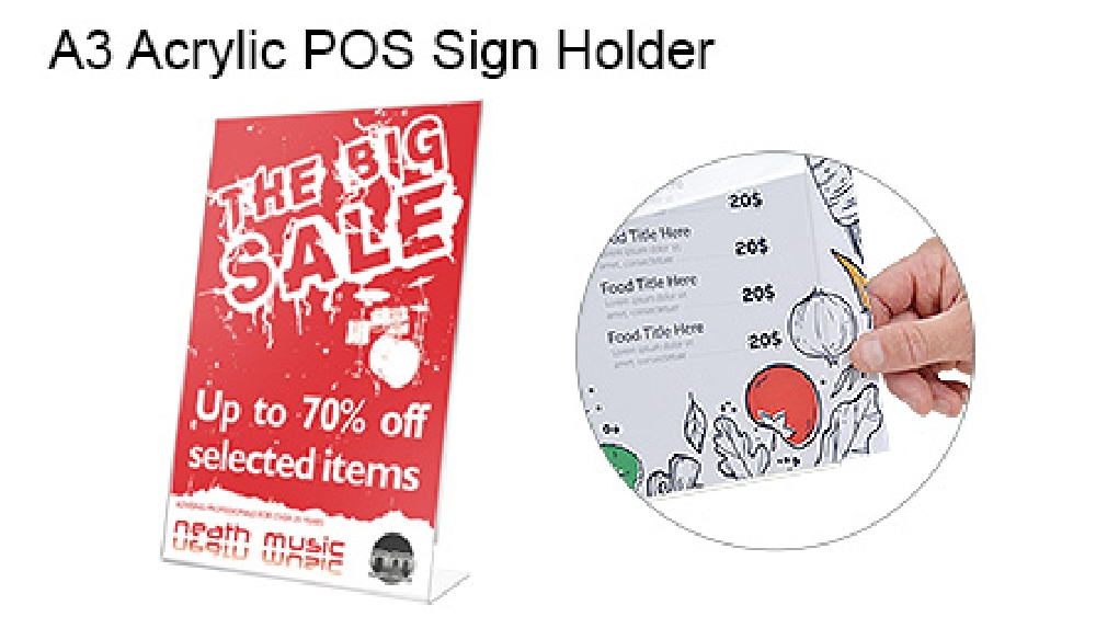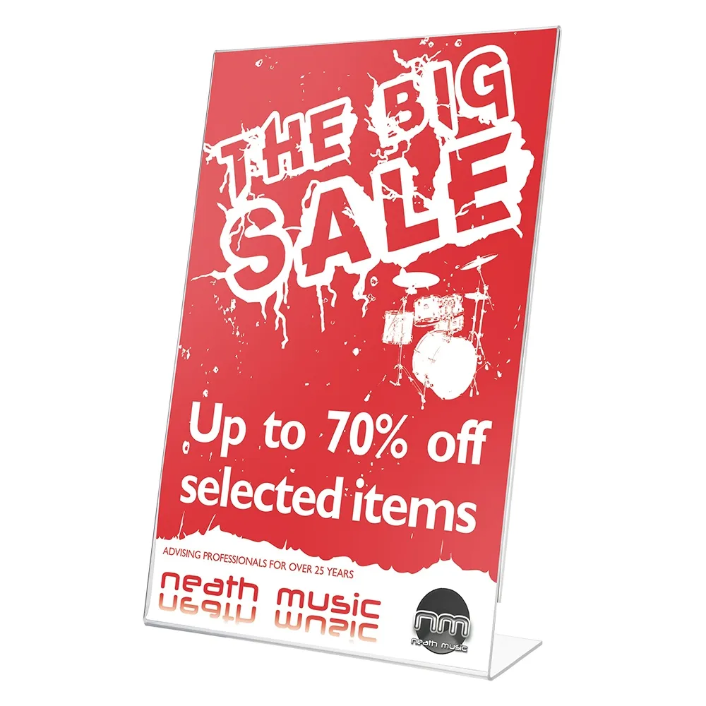 Posting sign holders around your shop will help emphasise sales, services or promotions that you have in store. They are also great if you want to protect your advertisements from everyday wear and tear. To use the sign holder, simply print your graphics on card and slide the A3 card into the side of the unit. This makes updating you sign holder a simple task.