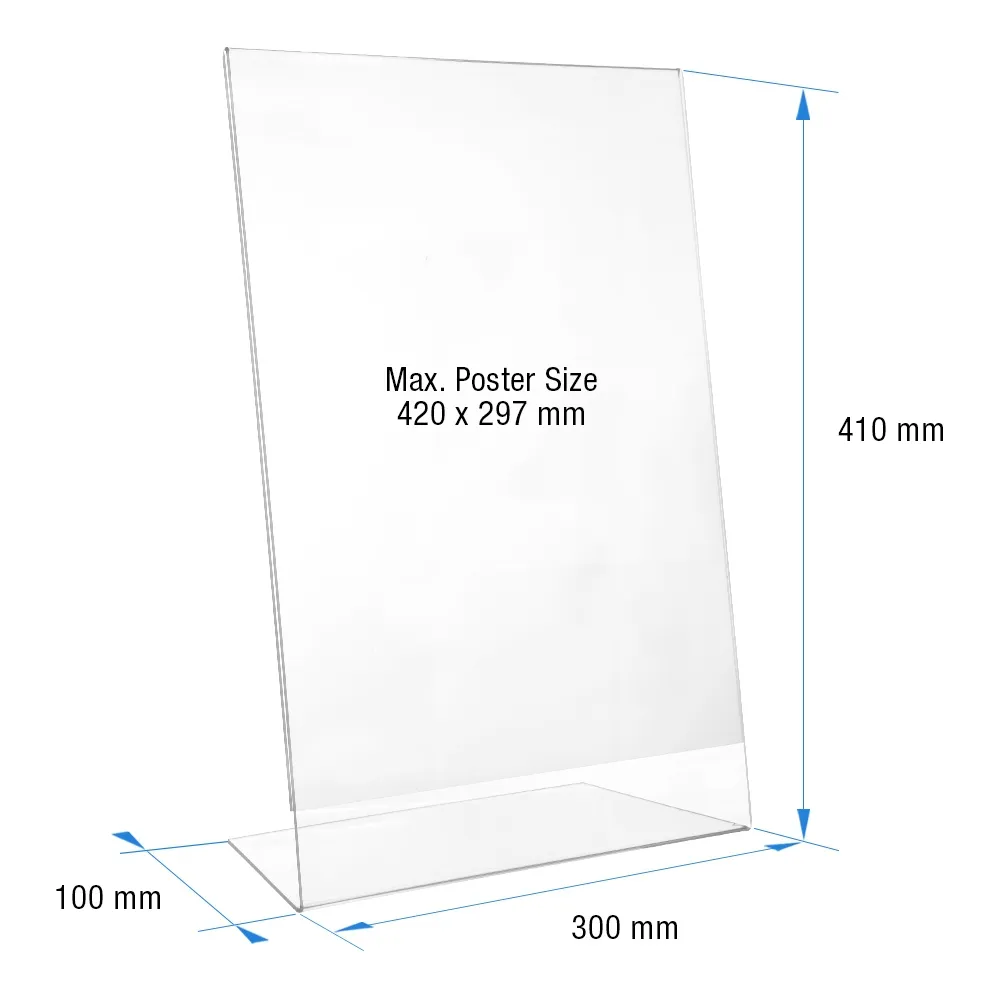 This sign holder is a great addition to any retail shop counter top display. The acrylic sign holder is easy to use and can display a single sided A3 size graphic in portrait format. The sign holder is designed with a slant to give people a better view of the sign when if is below eye level. These sign holders are cheap and can be displayed around any retail shop, restaurant or reception.