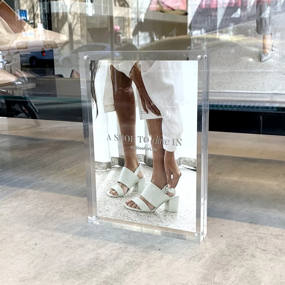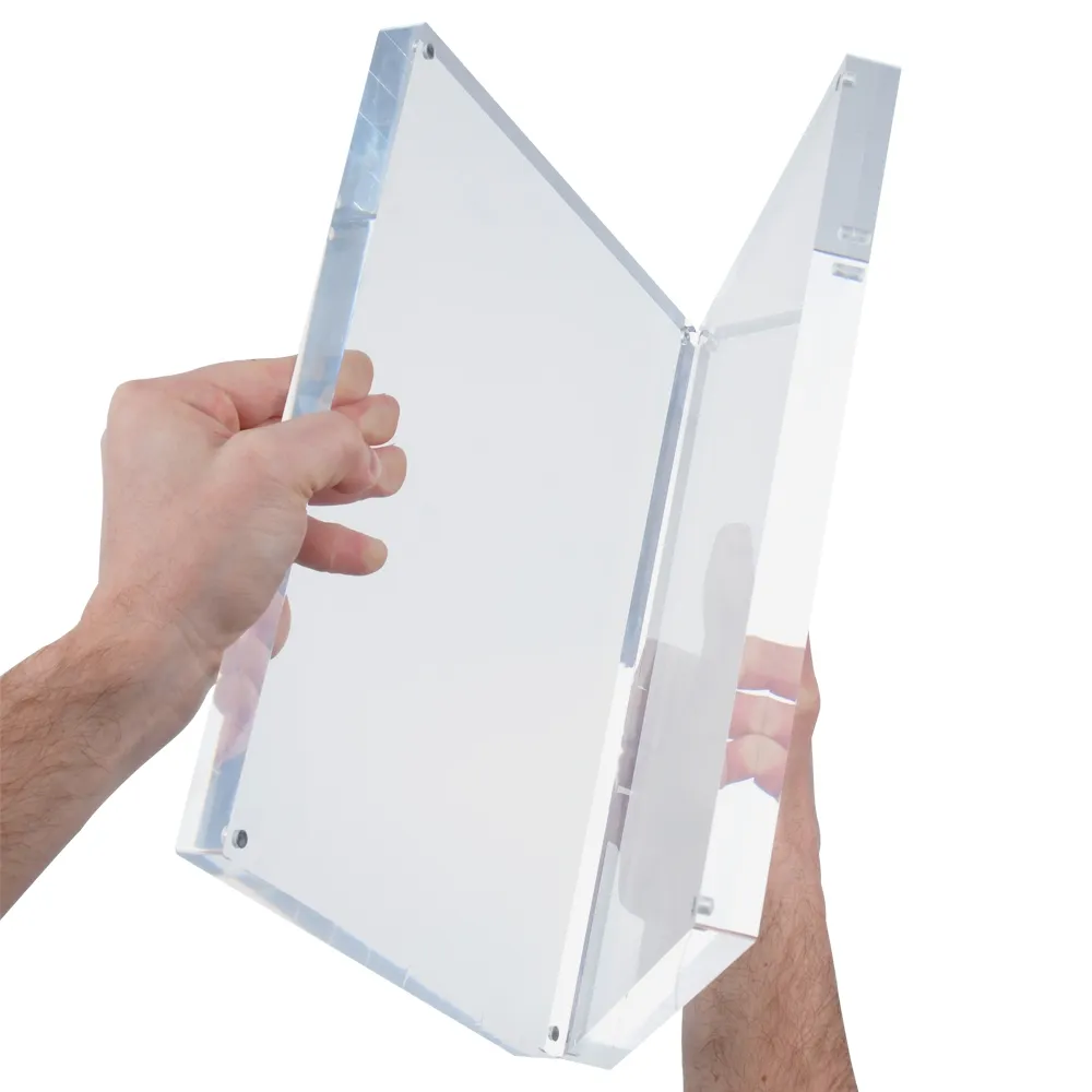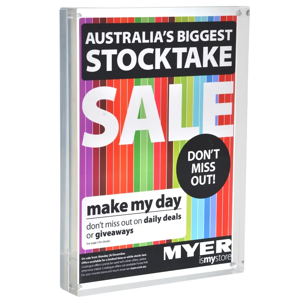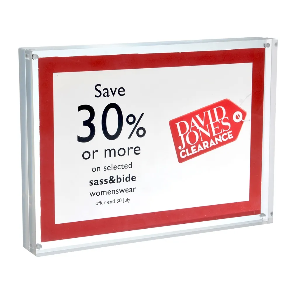 These A4 sign or POS displays are made from two solid sheets of 20mm acrylic that are held together with aggressive magnets. The resulting POS frame or photo display has a solid, upmarket and contemporary feel that commands attention and adds a touch of class to any room.