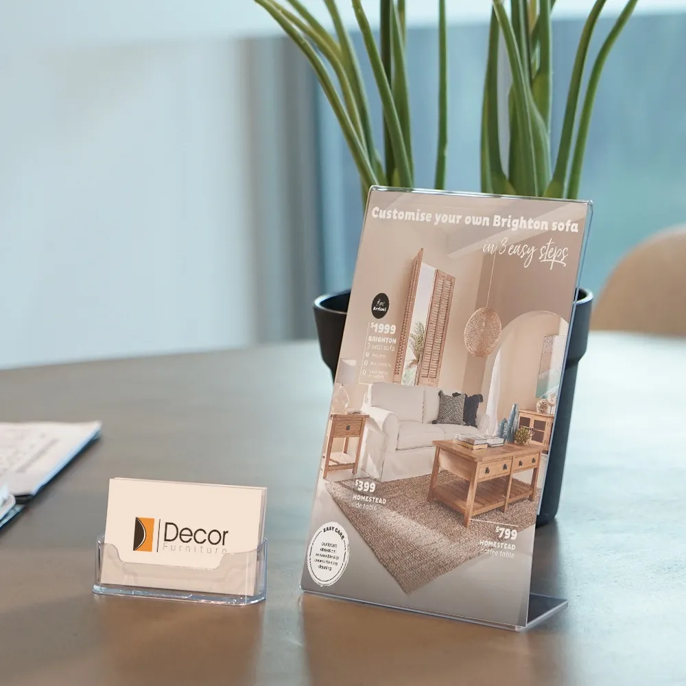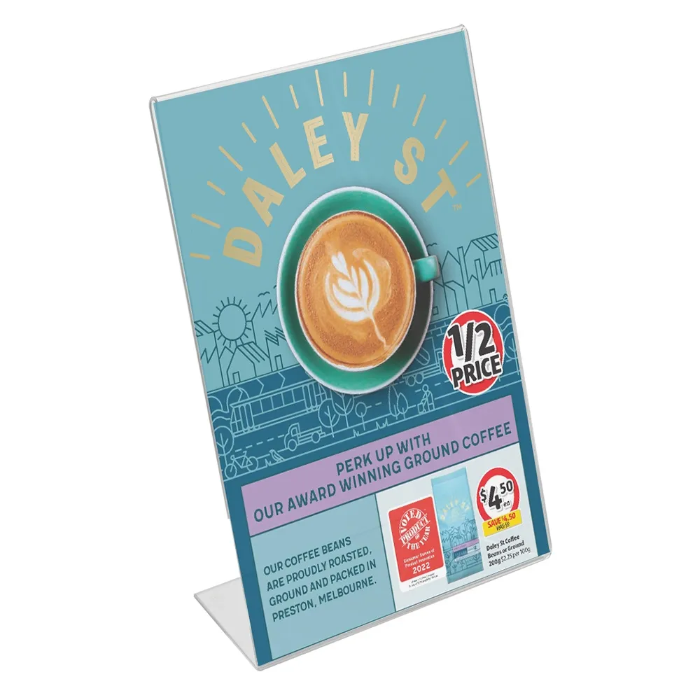 The vertical sign holder, part of our line of retail countertop signs, is made from 1.5mm thick clear acrylic to provide full visibility of inserted posters. The edges of the display are polished to provide the visual appeal of glass in a more durable and affordable package! This signage display is 215 x 150 x 65mm, perfect for placement on counter tops or near tills to provide promotional information to customers and visitors. Use this signage display in retail stores, cafes, restaurants, coffee shops, information centres, hotels, museums, gift shops, and more!