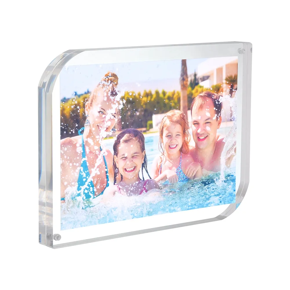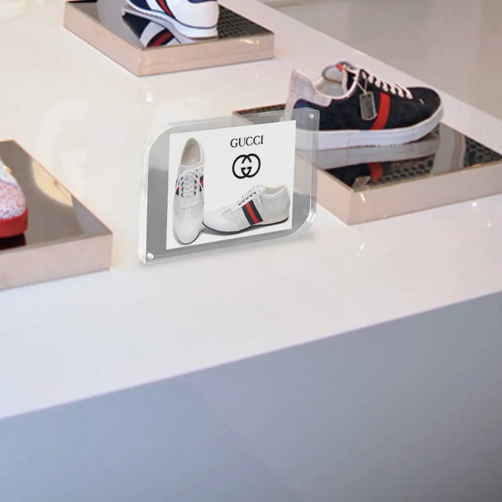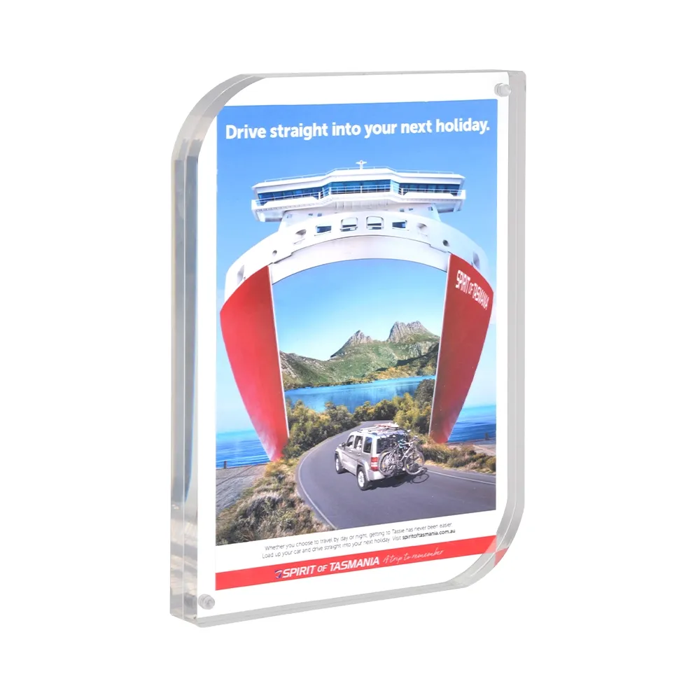The magnetic photo holders, acrylic block frames are 20mm thick, a premium quality unit that has the benefits of a glass display without worry of durability and with a lower cost! The edges of this unit are polished, with two sides featuring a curved design that help to create an eye-catching display for placement in any business. Retail stores, museums, news agents, cafes, restaurants, pubs, and exhibition halls are just some the businesses that have bought this style of product.