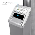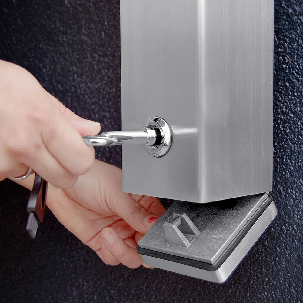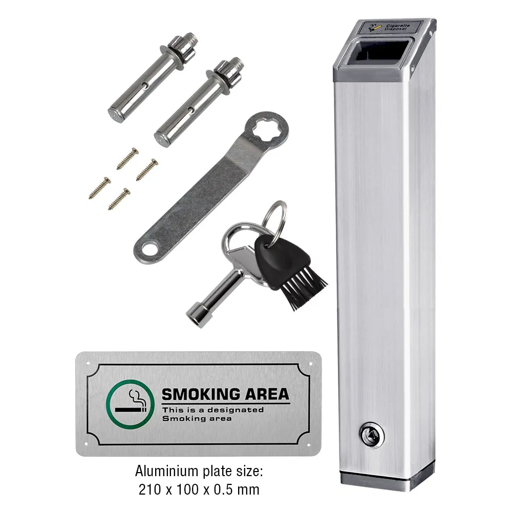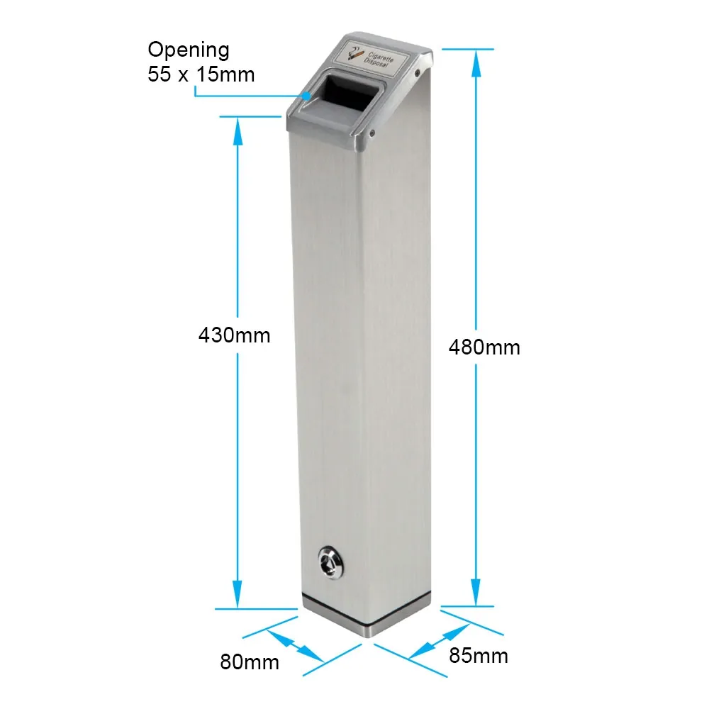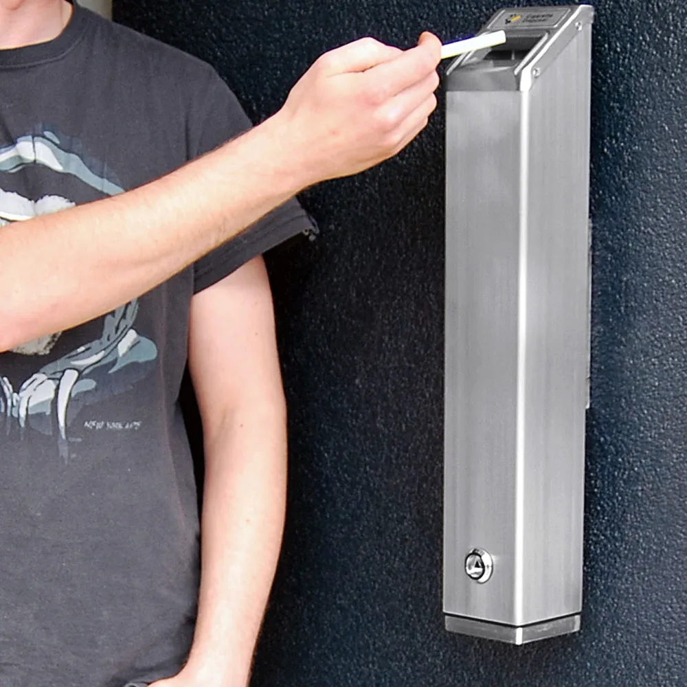 The wall mounted ashtrays, like a cigarette disposal container, are lockable to help prevent tampering in public areas. The hinged door at the bottom of the casing can be opened using the included key to empty the contents into a rubbish bin or bag for easy cleanup. There is also a brush include to help with overall cleaning. The top of the holder is angled to help prevent water from pooling, and there is a gutter around the top opening to disperse water away from the entry point.