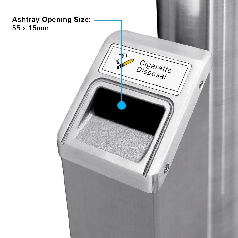 In need of wall mounted ashtrays? This butt bin helps you maintain a tidy smoking area outside your business, restaurant or other location. The cigarette receptacle is weatherproof, made from a tough aluminium body with a satin silver finish with chrome accents, perfectly complementing different decors and providing a professional look. The angled top has a 55 x 15mm opening for passersby to deposit their ashes or butts easily. The top also has "Cigarette Disposal" engraved to help identify what the bin is meant to be used for.