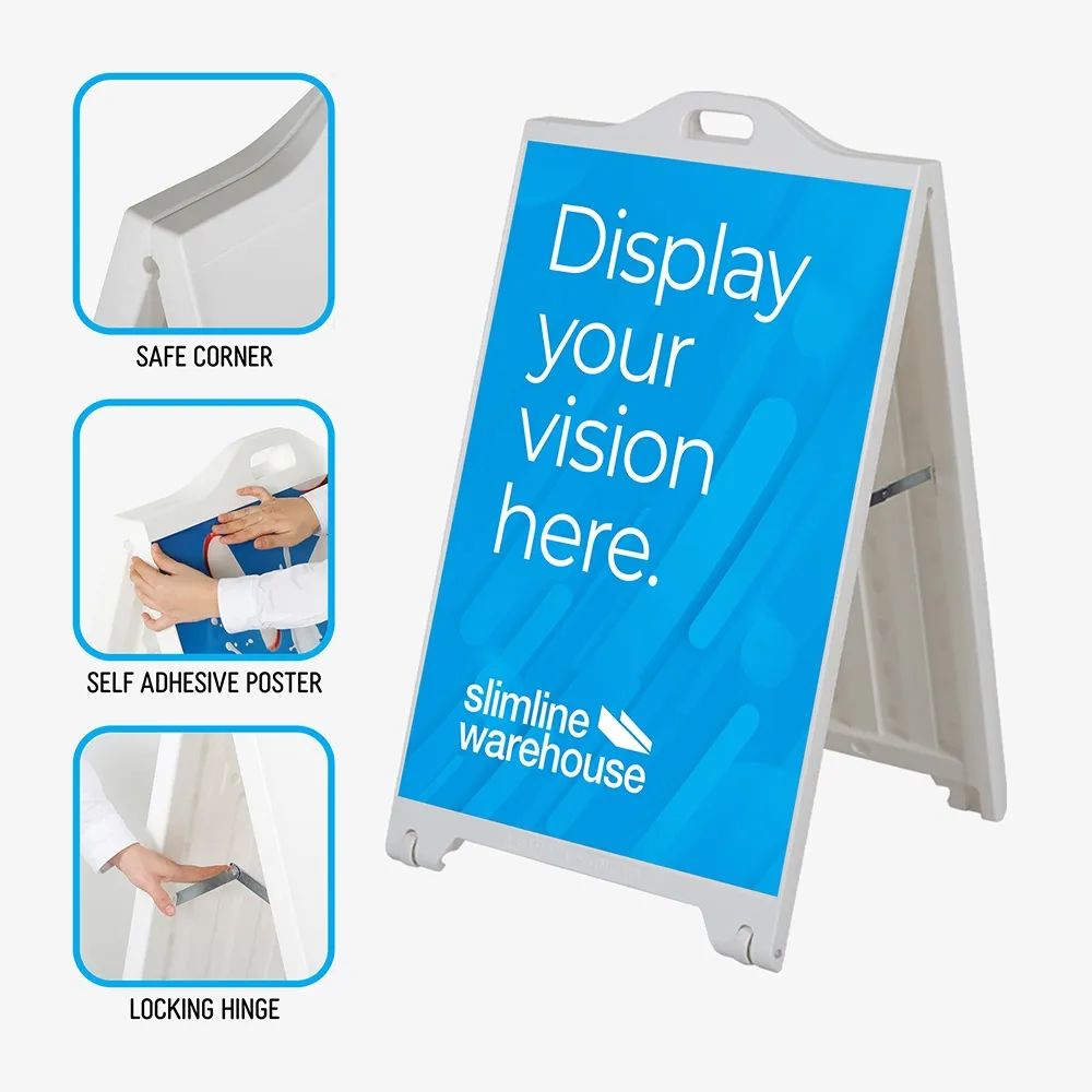 These corrugated plastic A frame signs are perfect for indoor or outdoor use thanks to their durable design that offers an affordable display for any budget! These outdoor pavement signs include (2) 600 x 900mm posters, one for each side, with your custom designs! Using a 2-sided display is a great way to maximise exposure, offering visibility in multiple directions at one from a single vantage point to easily promote to passersby. Your graphics are digitally printed onto self-adhesive posters using vivid colours to create rich imagery that will draw attention in front of any location. Our in-house team is available for design assistance as well, with three tier options to choose from to find the right amount of help for your business..