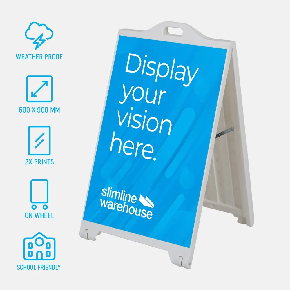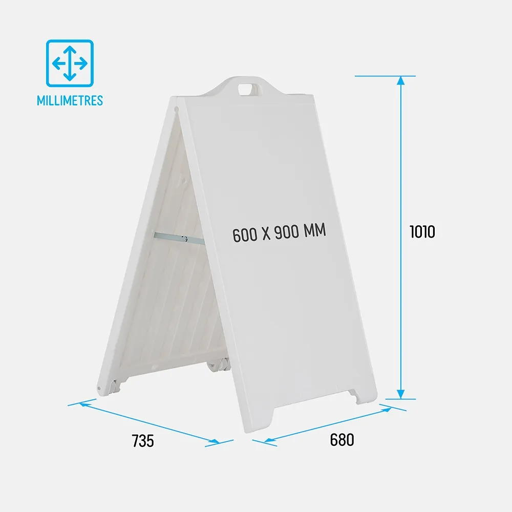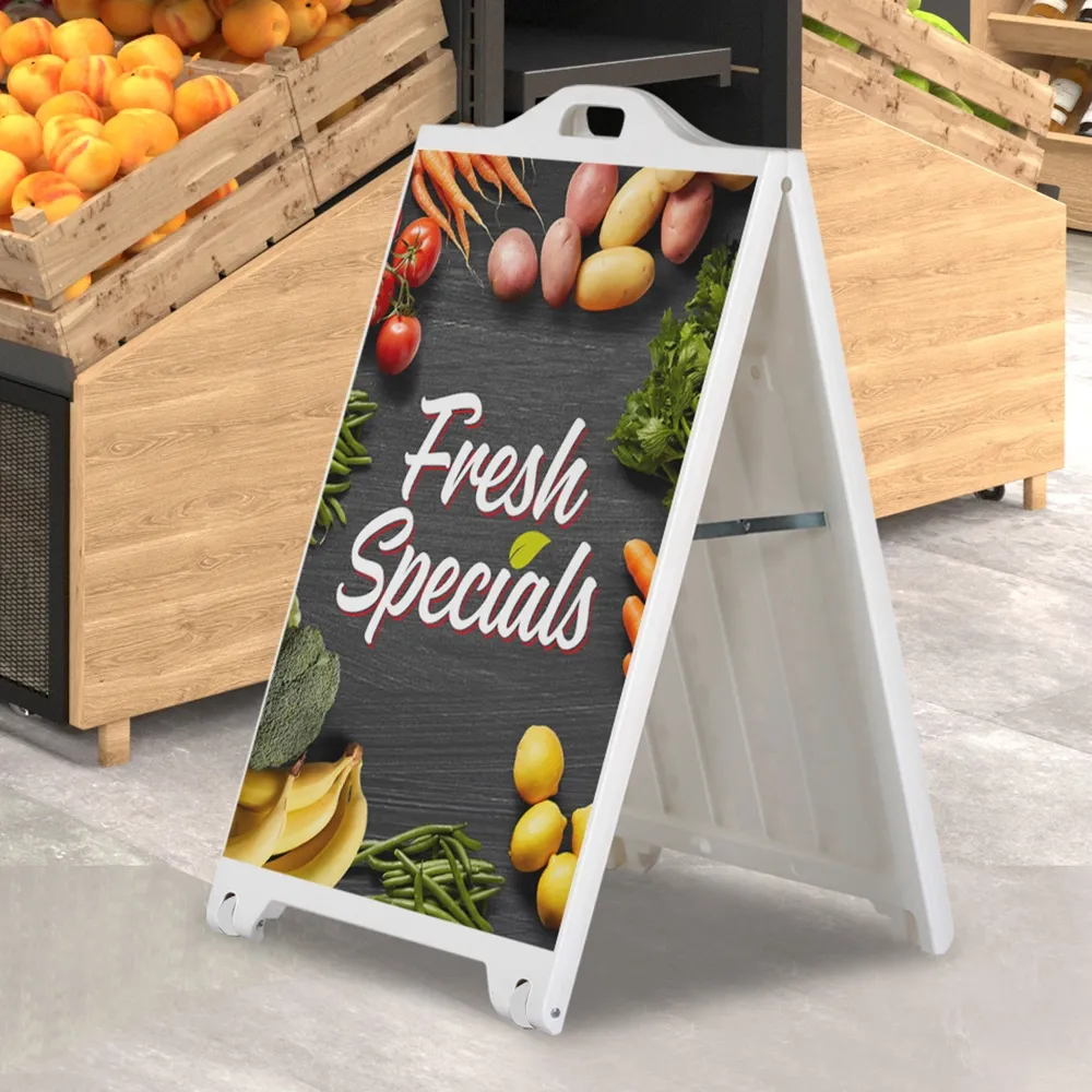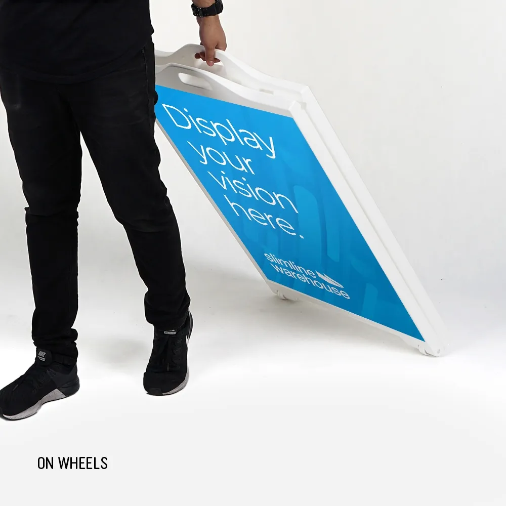 The portable advertising signs, corrugated plastic A frame signs are easily portable displays, with a built-in handle atop the unit making carrying the 11.34kg pavement sign simple. There are (2) wheels on the base as well to allow rolling the A board into desired position as well. This unit is 680 x 1010 x 735mm when fully opened, with (2) metal hinges inside the board keeping the pavement sign from giving out and ensuring it is at it's most stable position during use. The whole unit folds down to 80mm thick, making it easy to store in a small space in between uses!