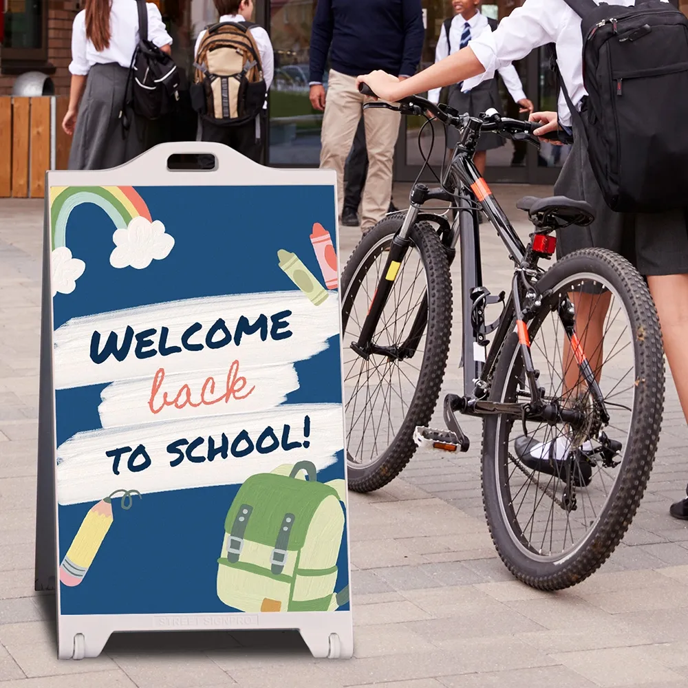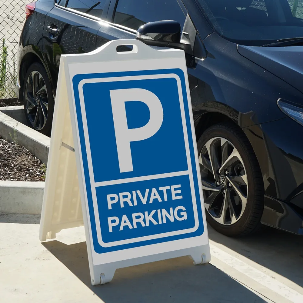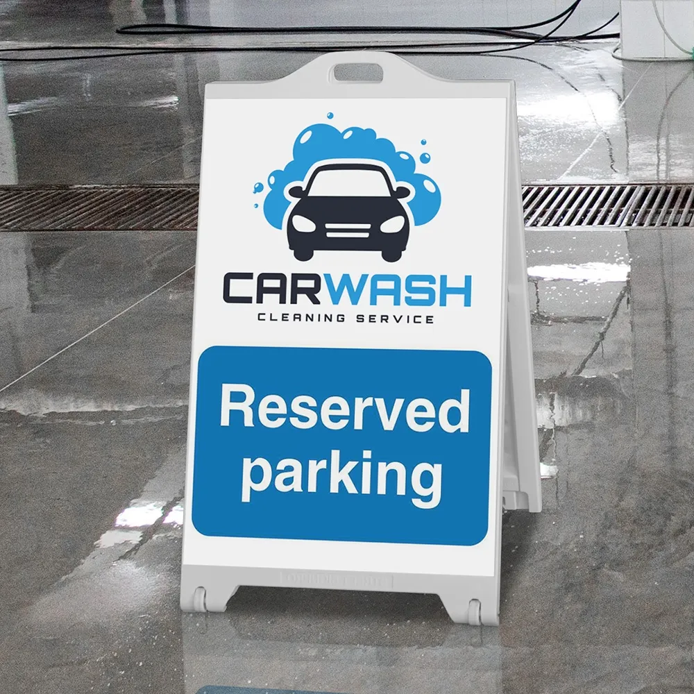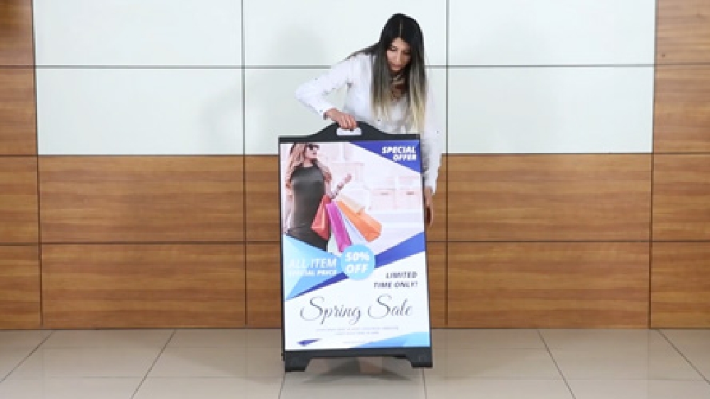 The portable advertising signs, corrugated plastic A frame signs are easily portable displays, with a built-in handle atop the unit making carrying the 11.34kg pavement sign simple. There are (2) wheels on the base as well to allow rolling the A board into desired position as well. This unit is 680 x 1010 x 735mm when fully opened, with (2) metal hinges inside the board keeping the pavement sign from giving out and ensuring it is at it's most stable position during use. The whole unit folds down to 80mm thick, making it easy to store in a small space in between uses!