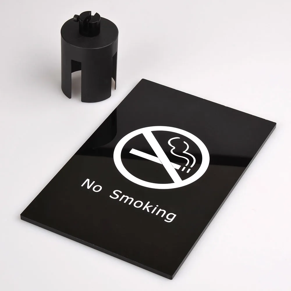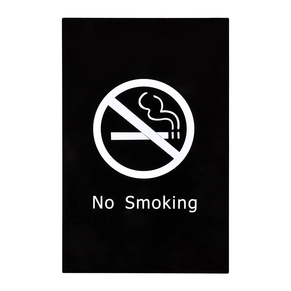 - Black acrylic sign says "No Smoking" in easy to read white lettering