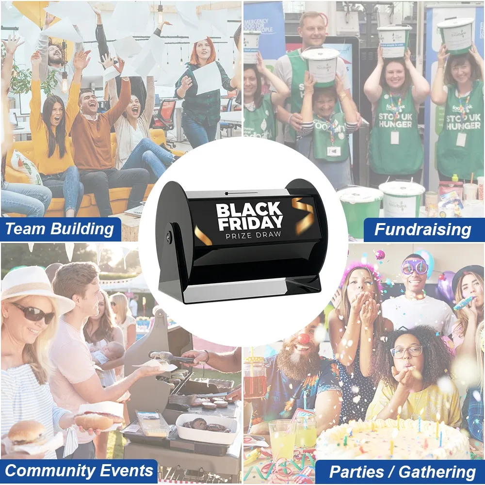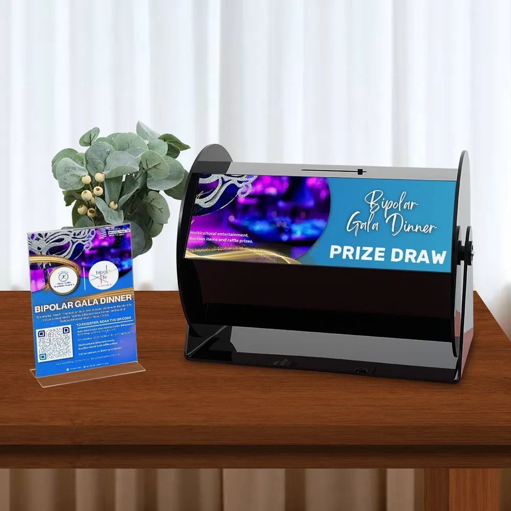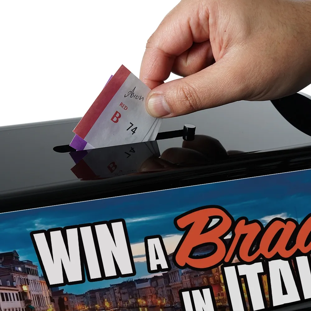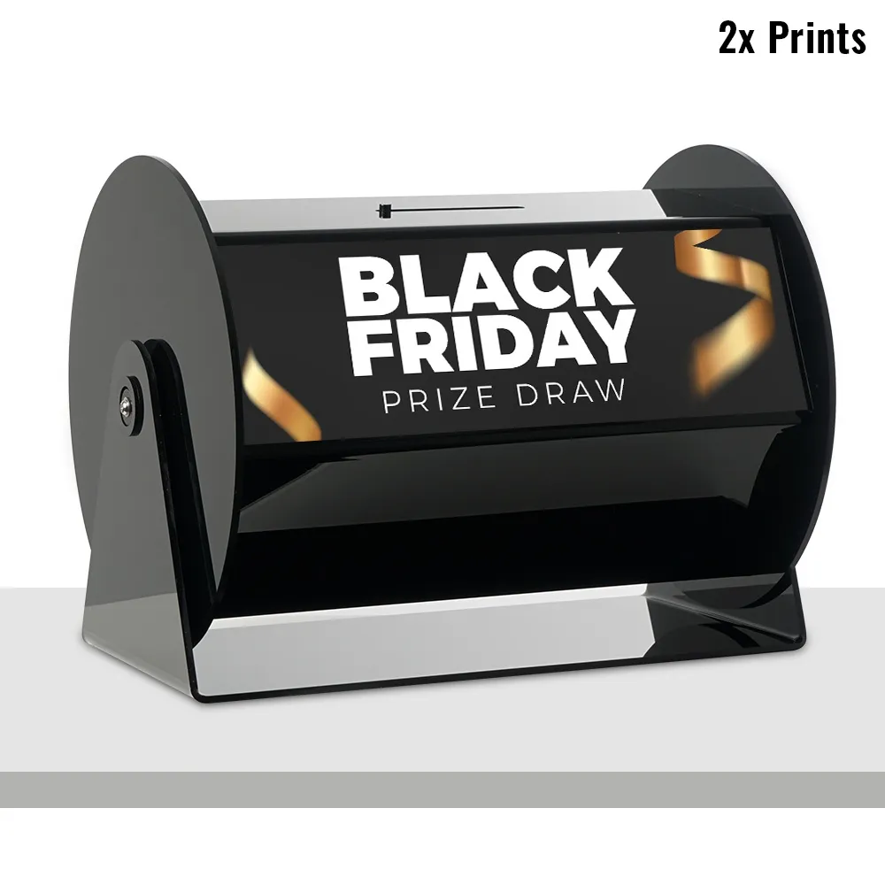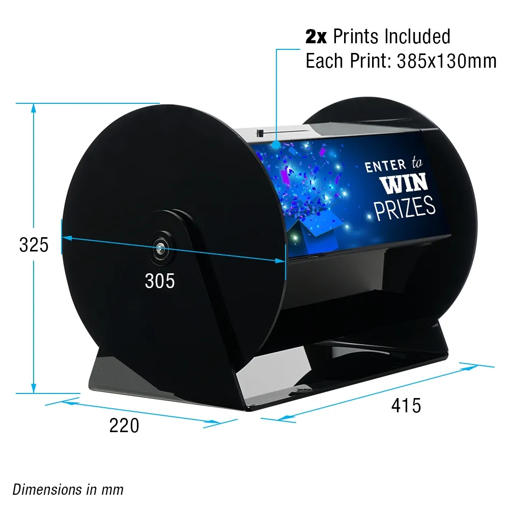 - Custom printed 130 x 385mm graphics on two sides brands raffle drum