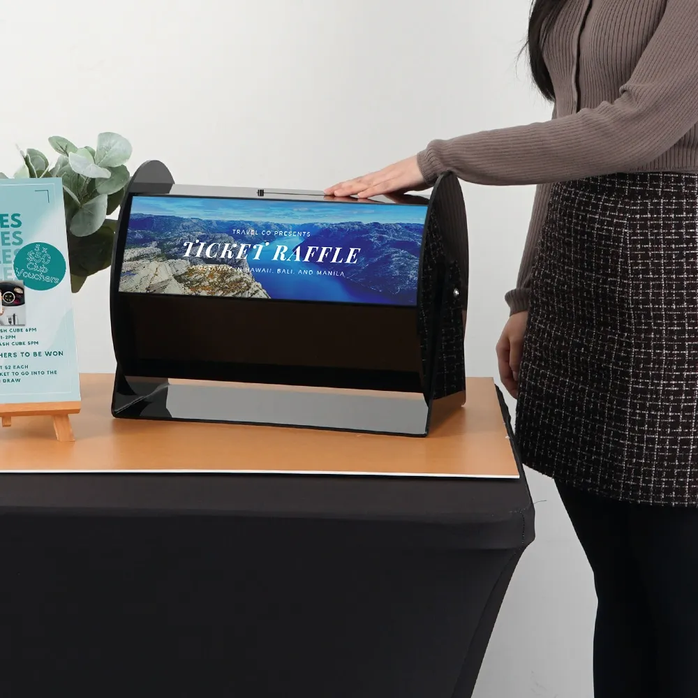 This raffle barrel is made from 5mm thick black acrylic with polished edges, offering a sleek look that obscures the interior contents to offer some mystery during drawings. At only 3.36kg, the tombola drum is easy to carrying into position or transport to events. Rubber feet on the base help keep the unit in place and prevent damage to surfaces. Order online today for quick shipping to anywhere in Australia to be ready for your next event, only from Slimline Warehouse!