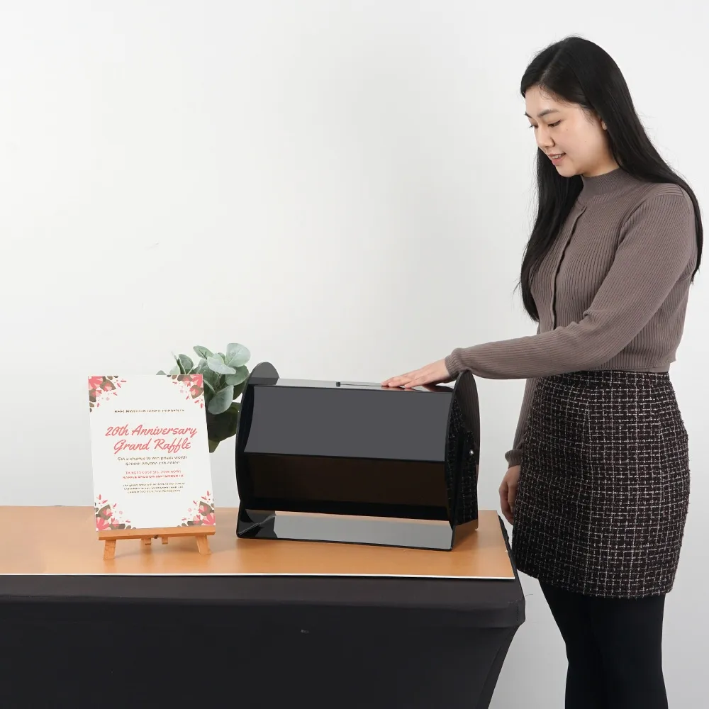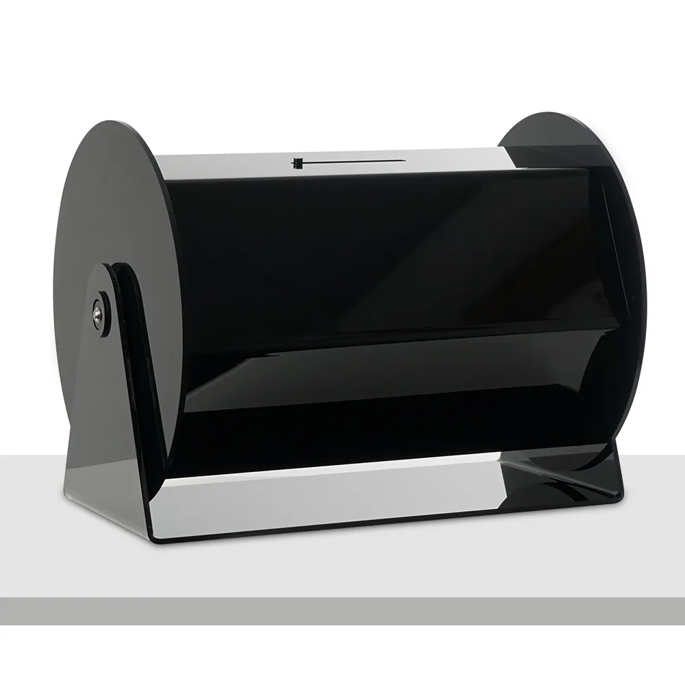 The rotating raffle drum, like competition barrels and ticket mixers, features a locking design that prevents tampering with entry forms once submitted. The door is near the edge on one side of the hexagonal drum and is large enough to make removing the winner easy. These drums are made from 5mm thick black acrylic with polished edges, offering a stunning look that helps to draw attention whilst obscuring contents within to add intrigue to your event.
