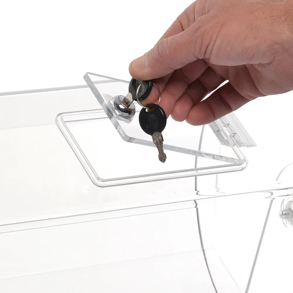 This acrylic raffle drum, from our line of clear plastic displays, features 5mm thick clear acrylic build to allow full view of items inside the container whilst ensuring long-lasting durability. The slot is 10 x 80mm to accept donation envelopes, entry forms and more. There is a sliding bar as well that keeping anything inside from falling out whilst spinning the drum. This barrel freely spins 360° to mix up the container contents and help make randomised drawings possible. The bottom has a locking hinged door that keep items from being tampered with and makes removing a winning entry or emptying the container easy.