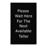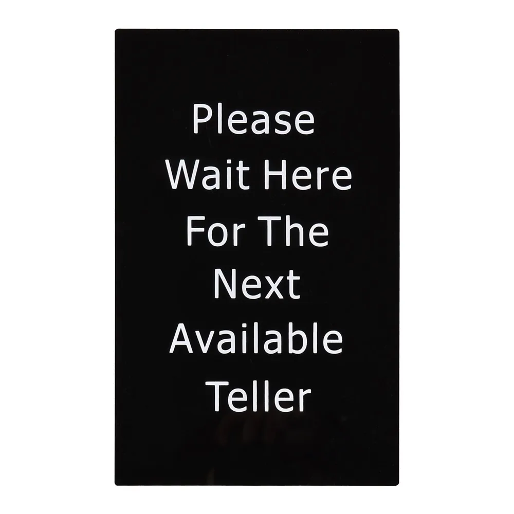 - White lettering " Please Wait Here for Next Available Agent" is on black acrylic