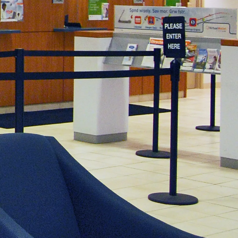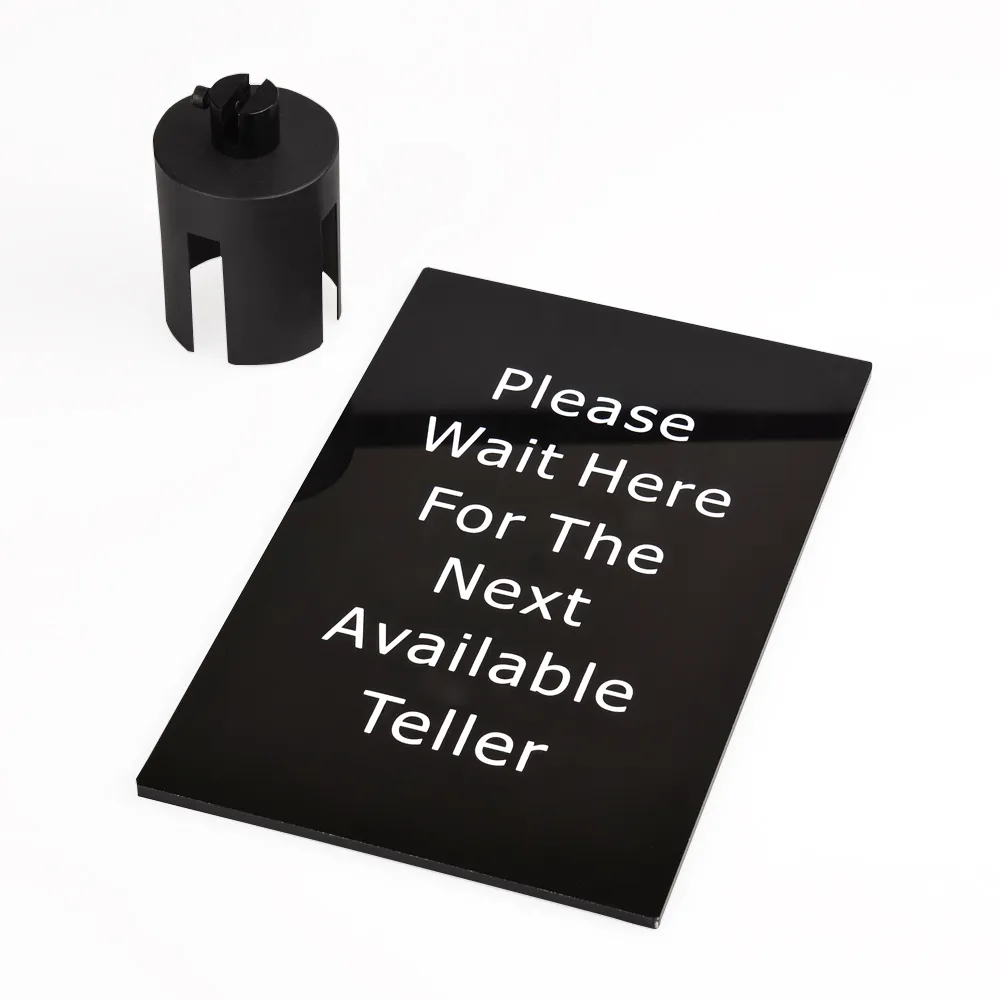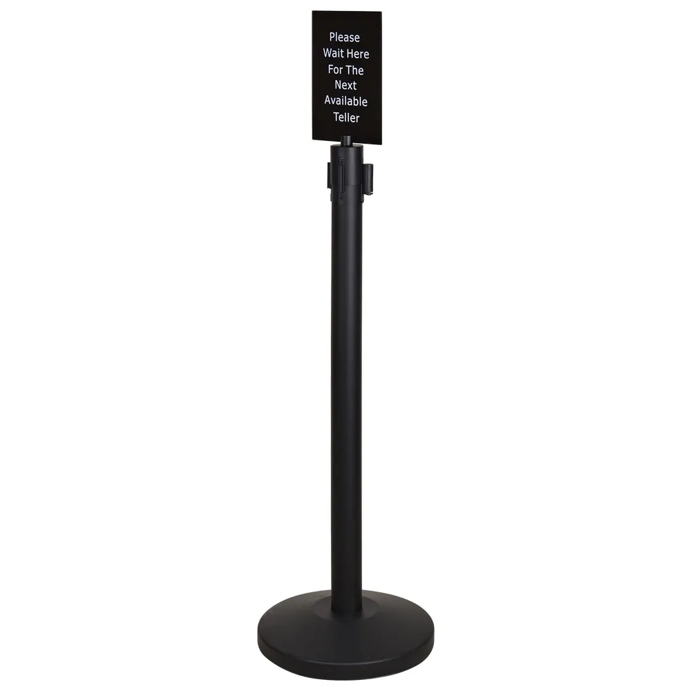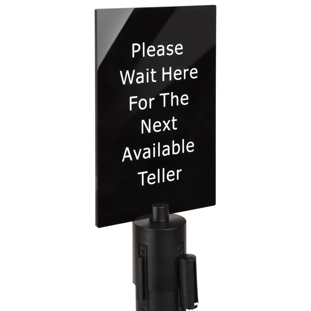 Stanchion sign frames, also known as retractable belt barriers and crowd control ropes, have the phrase "Please Wait Here for Next Available Agent" inscribed to help direct customers and visitors to your location on where to go whilst they queue. The sign is written in white lettering, offering a great contrast to the 5mm thick black acrylic signage to make reading easy for any person.