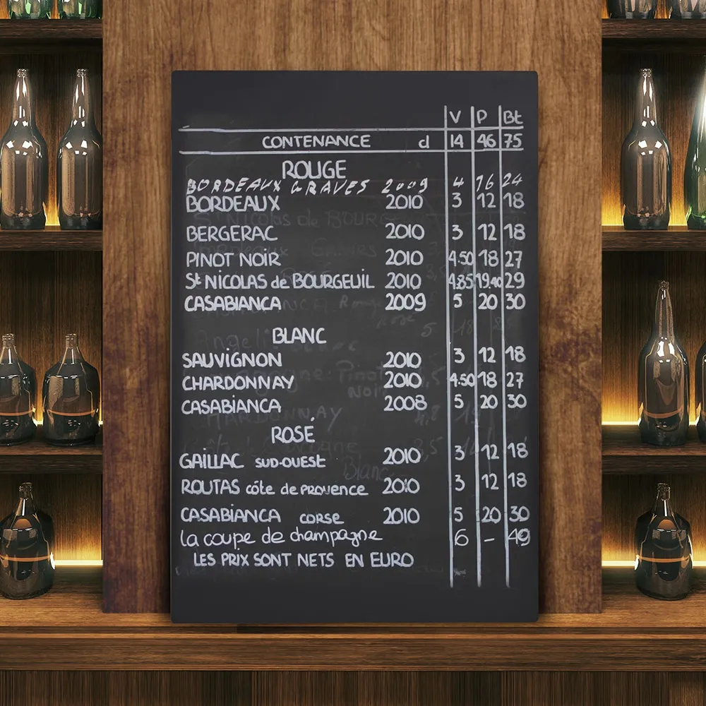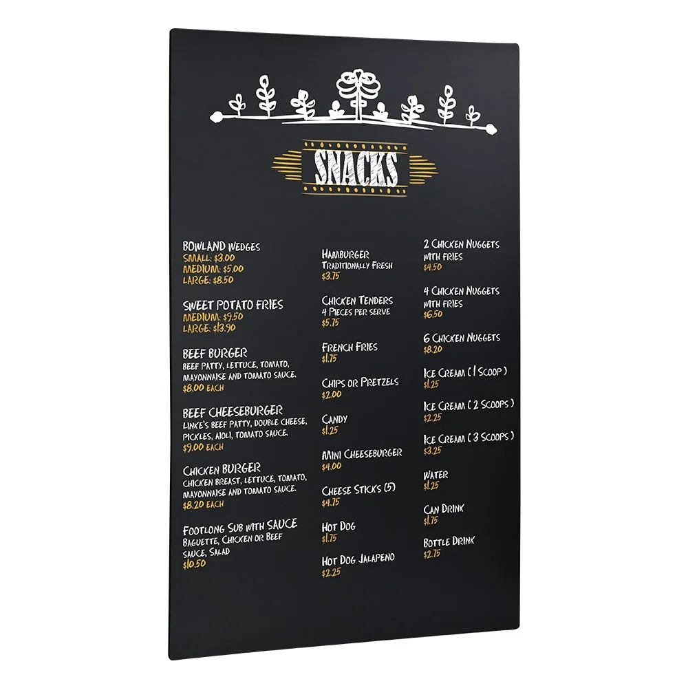 This menu chalk board, black write on board can be used to create eye-catching adverts or menus in pubs, retail stores, cafes, shopping centres, and more. The blackboard display is 600 x 900mm to make creating highly readable signs using larger lettering easy. The 3mm thick board features rounded corners, offering durability and safety for use in all locations.