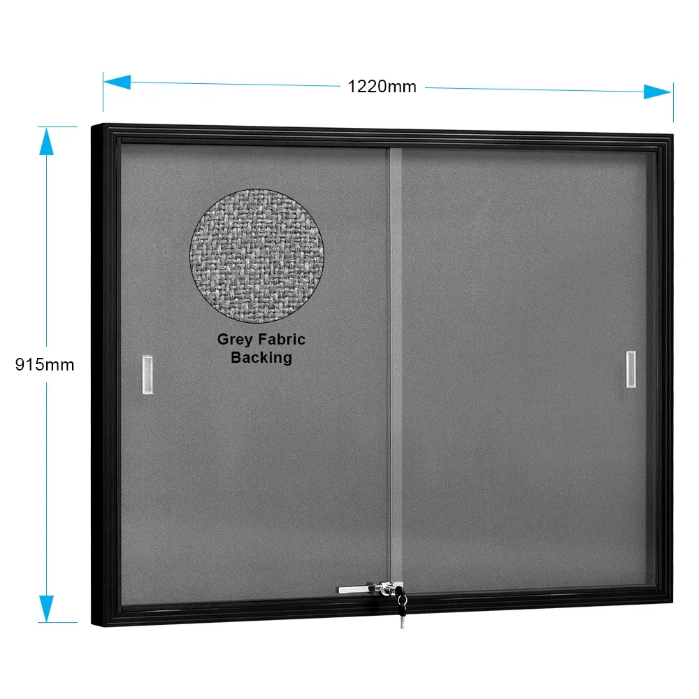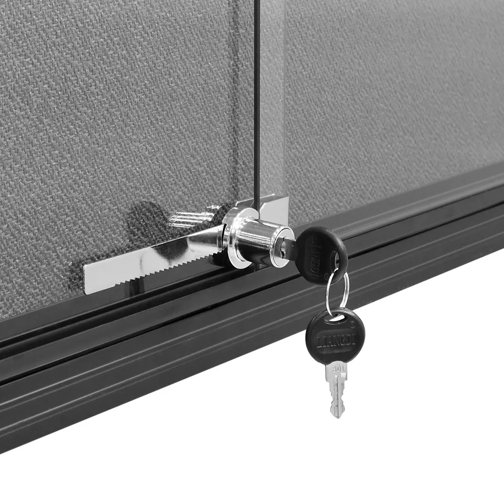 The office notice board, like many enclosed fabric boards, uses a self-healing corkboard for holding up posters and notices. The large 1150 x 845mm area has heaps of space for a variety of items to be displayed using staples, tacks, push-pins, and more. Woven grey fabric over the top of the cork board offers a professional appeal whilst helping keep focus on the displayed notices. The showcase lock goes between the two panels to keep them from being opened when in place, effectively deterring tampering with the case contents. The overall 1220 x 915 x 48mm size fits nicely onto a wall without protruding outwards enough to interfere with passersby.