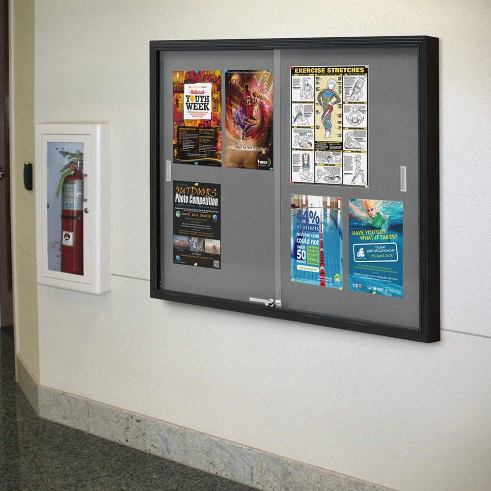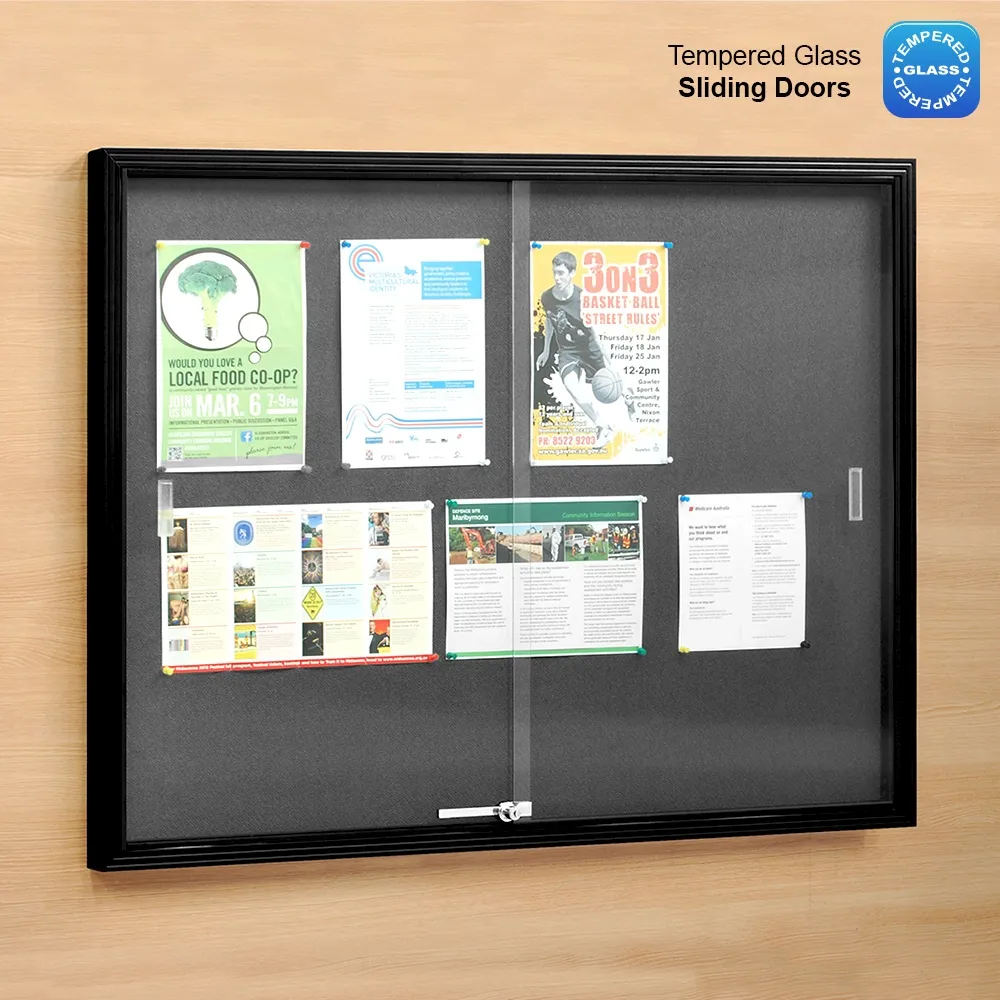 - Locking glass bulletin board features sliding tempered glass doors with etched handles for opening
