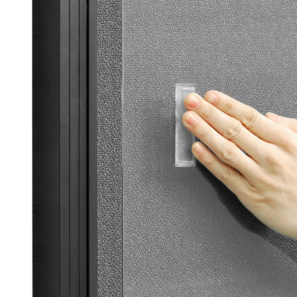 - Self-healing corkboard beneath grey fabric is accepting of staples and tacks for postings