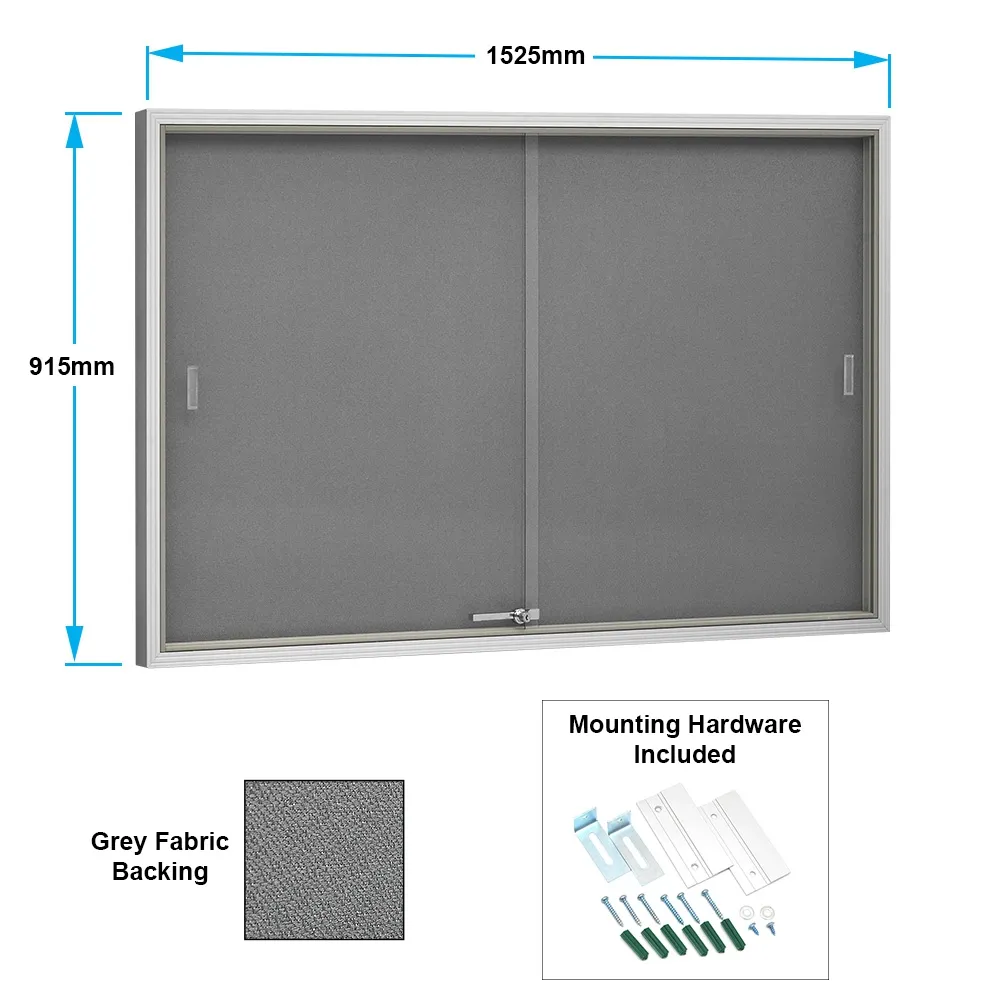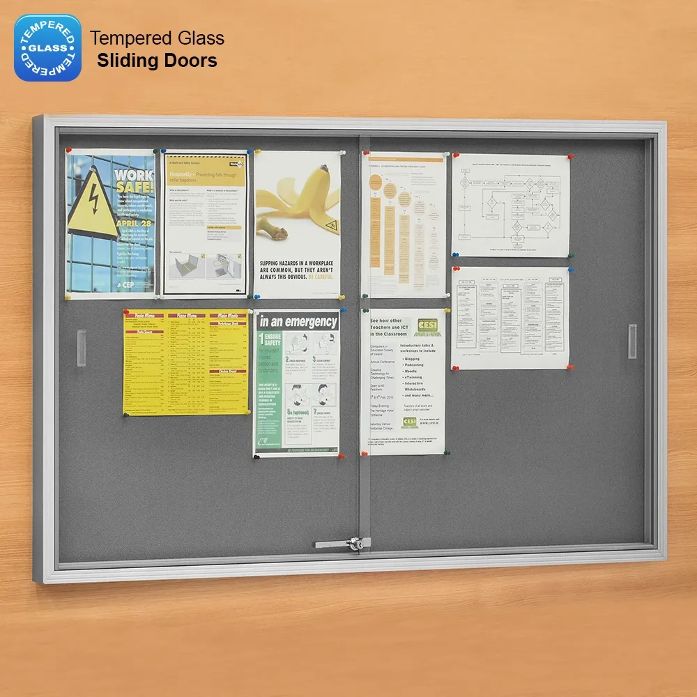 Fabric message boards, enclosed glass noticeboards, and other fabric boards feature sliding glass doors made out of tempered glass in order to be shatter resistant. The doors are on sliding guides that help to make opening and closing the doors very easy. These fabric boards have a large 1450 x 840mm surface area that provides ample space for placing notices and memos for all to see.