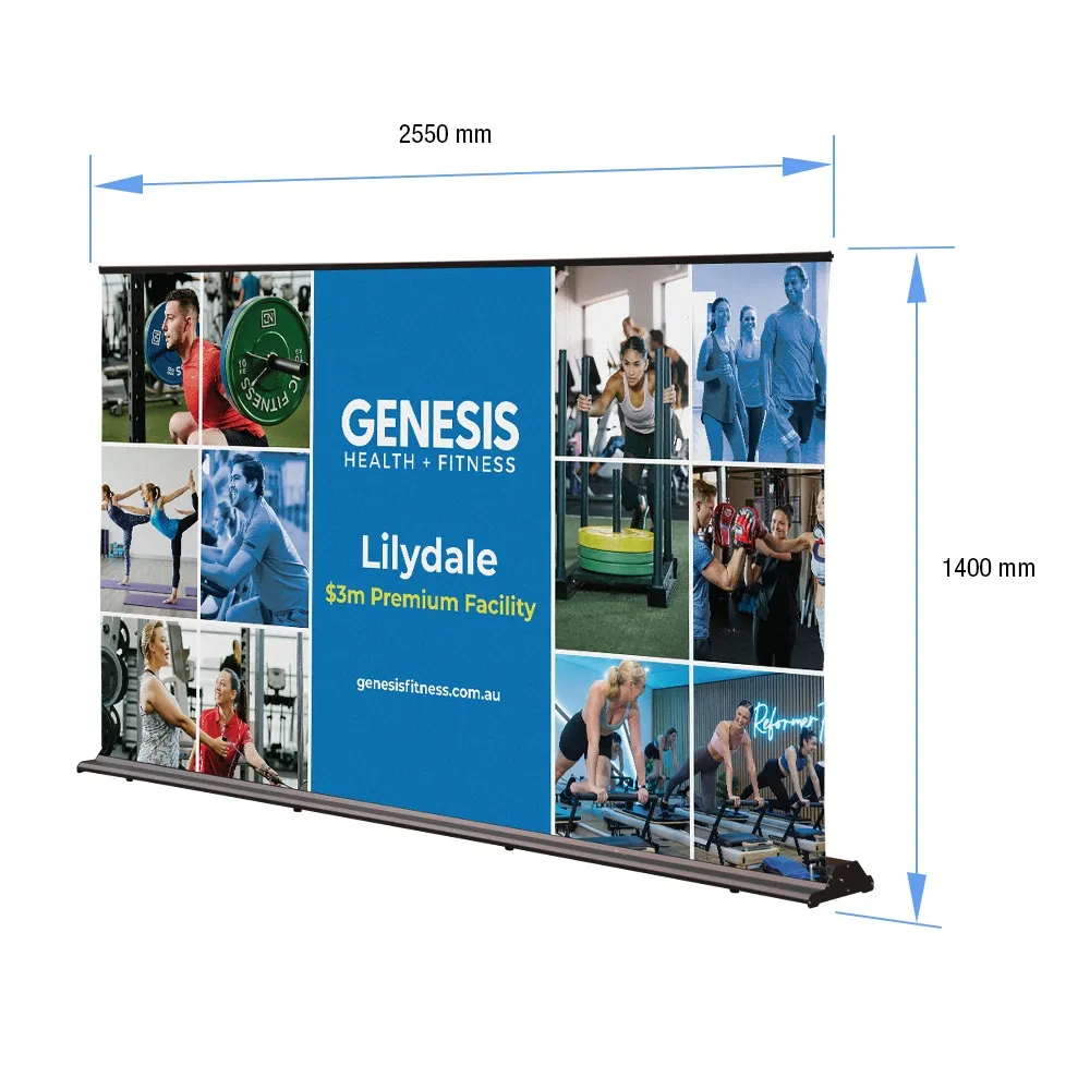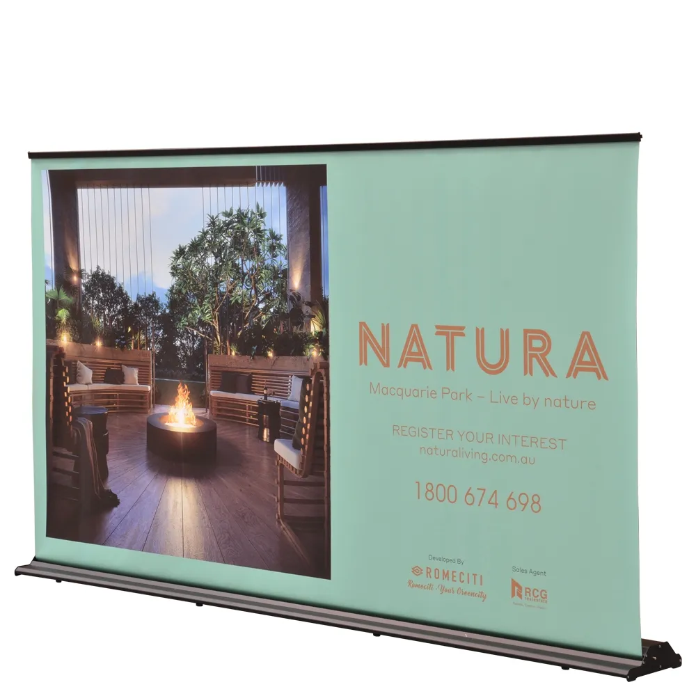 - Display banner features aluminium frame with vinyl graphic for long-lasting use anywhere