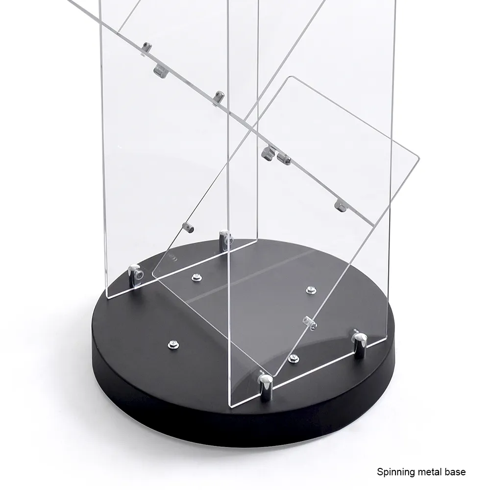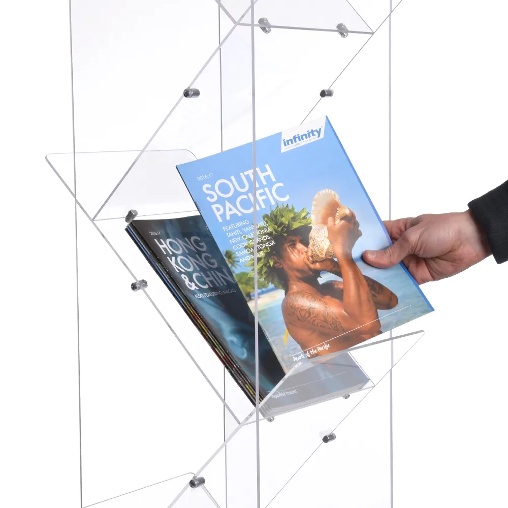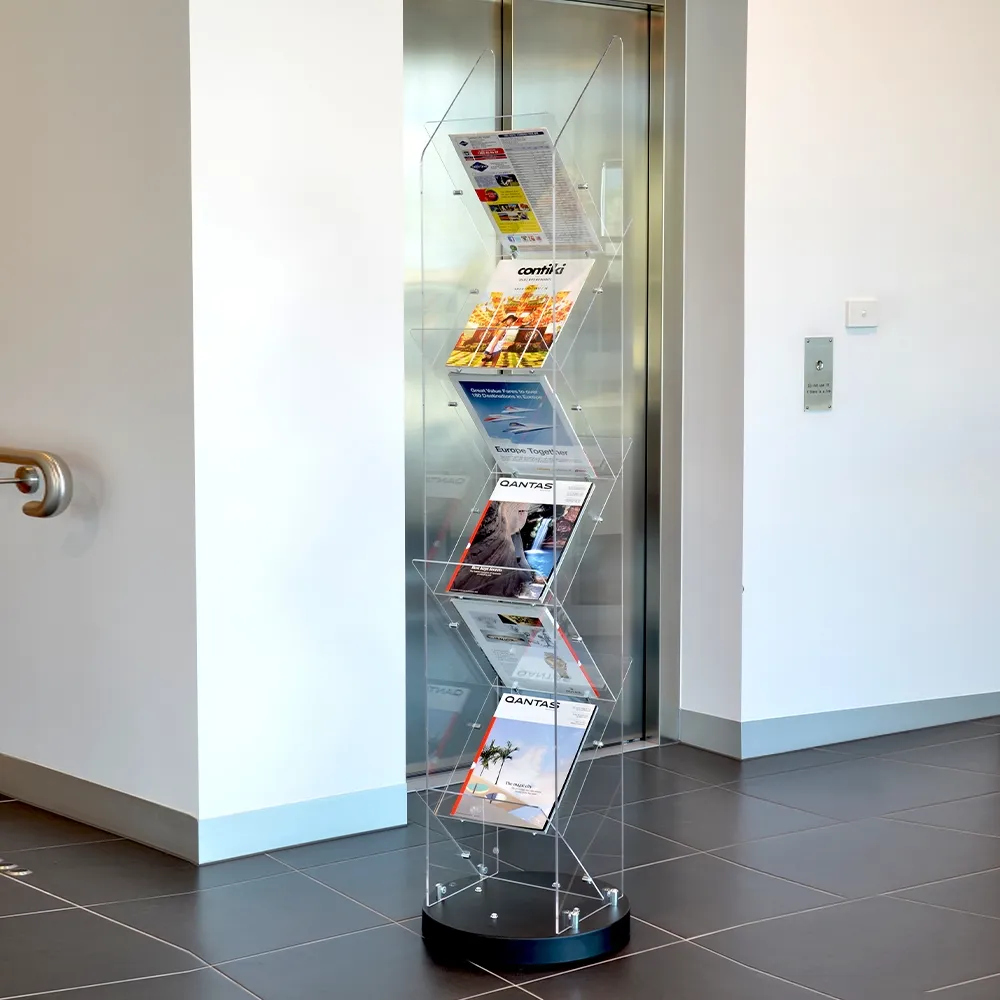This magazine floor stand is a rotating stand, making it easy for visitors to access brochures no matter where they stand! The spinner base is made from metal and using aluminium fitting to secure the beautiful clear acrylic shelves to the the unit in a modern manner. These literature displays are dual-sided, maximising space by offering lots of options without taking up room on the floor! The unit is made from 5mm thick clear acrylic on the sides, with each pocket made of 3mm thick acrylic to help keep costs down whilst still offering a sturdy unit! The unique zig-zag design of the pockets is definitely an eye-catcher.